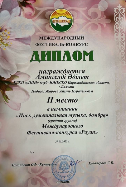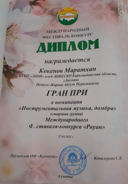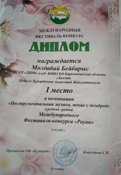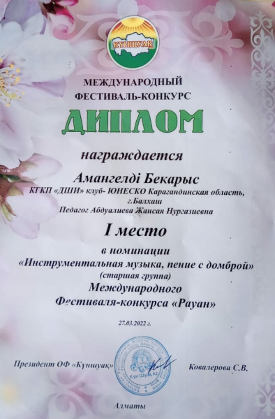 27 марта в городе Алматы в оффлайн формате был организован Международный конкус «Рауан». В конкурсе приняли участие учащиеся по классу домбры, традиционного пения, вокал по разным возрастным категориям. Итоги кокурса: