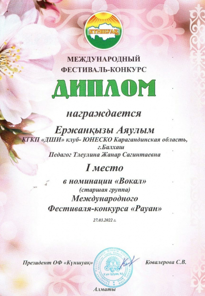 2. Ержанқызы Аяулым - 1 место (пед.Тлеулина Ж.С.)