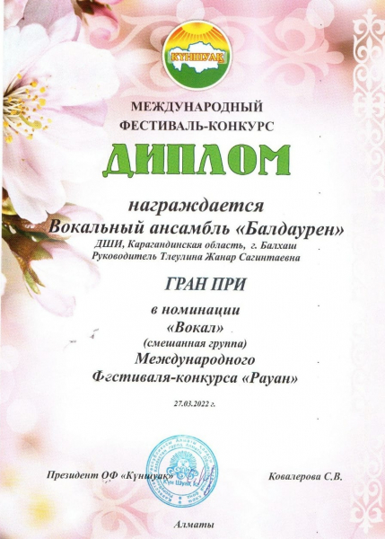 1. «Балдәурен» вокалдық ансамблі - ГРАН ПРИ (пед.Тлеулина Ж.С.)