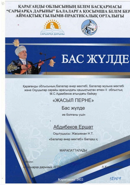Қарағанды облысының Балалар өнер мектебі, Балалар музыка мектебі және Оқушылар сарайы арасындағы қашықтықтан өткен II облыстық М.С.Адамбеков атындағы «Жасыл перне» байқауына мектебіміздің дәстүрлі ән сыныбының оқушысы Абдибеков Ершат қатысып, БАС ЖҮЛДЕ иеленді. (педагог: Жасымхан Н.Т.)