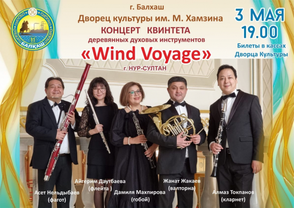Уважаемые балхашцы! Сообщаем, что 3 мая 2022 года в 19.00 часов во Дворце культуры им.М. Хамзина к 85- летию города Балхаш состоится праздничный концерт квинтета духовых инструментов «Wind Voyage», специально прибывшего из г. Нур-Султан. А также 15.00 в Детской школе искусств состоится мастер-класс для юных музыкантов.