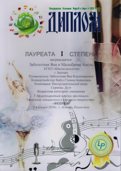 Учащиеся класса скрипки Школы искусств вместе с педагогом приняли участие в V Международном многожанровом конкурс-фестивале детского, юношеского и взрослого ворчества «Феерия», прошедшего 3-6 января 2018 г. в Астана.
