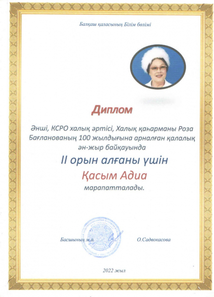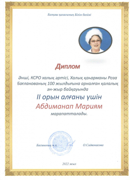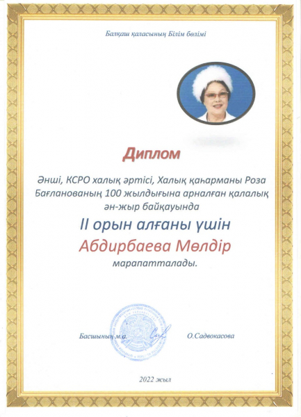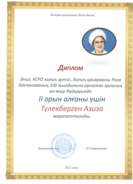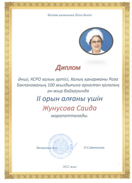 Әнші КСРО Халық әртісі, Халық Қаһарманы Роза Бағланованың 100 жылдығына арналған қалалық ән-жыр байқауының нәтижесі