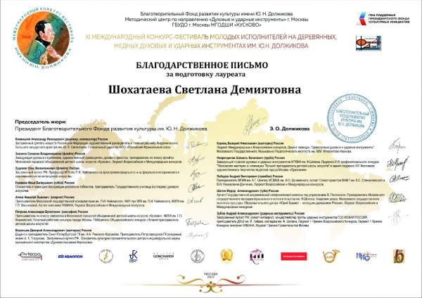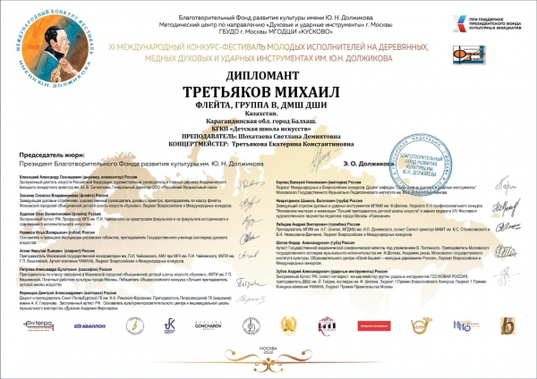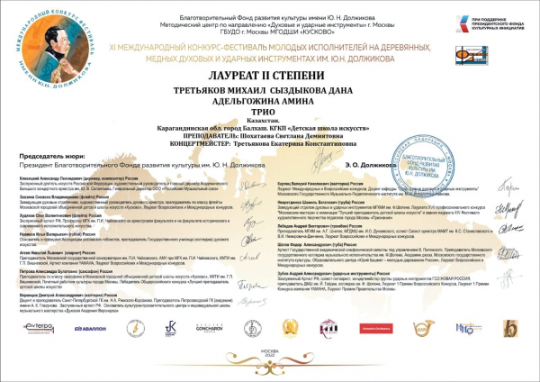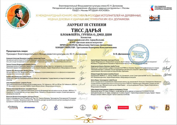 Тисс Дарья (6 лет)-лауреат 3-й степени, Третьяков Михаил ( 12 лет) - дипломант, трио флейтистов (Адельгожина А.14 лет, Сыздыкова Д.13 лет и Третьяков М.12 лет) – лауреаты второй степени. Очень отрадно за наших детей, которые не пасуют перед трудностями, которые со всей ответственностью относятся к подготовке к этому конкурсу, которых не пугает большое количество участников с высокой подготовкой. Мы выражаем огромную благодарность орг. комитету за организацию интересного, высокопрофессионального конкурса, который призван привлечь внимание к сохранению и продолжению лучших традиций духовой исполнительской школы, к выявлению молодых одаренных музыкантов. Мы очень признательны жюри, состав которого формируется из профессорско-преподавательского состава ведущих ВУЗов искусства и культуры, ученых, музыковедов и концертных исполнителей России и зарубежья. Мы всегда рады участвовать в вашем конкурсе, который даёт стимул и надежду двигаться к новым достижениям в мастерстве исполнительского искусства. Желаем вашему проекту процветания и больше сильных, в профессиональном плане, участников.