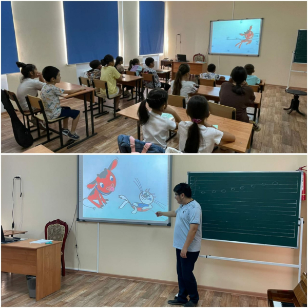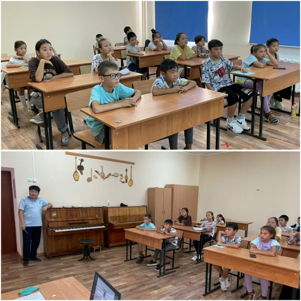 Балалар өнер мектебінде жұмыс жасап жатқан «Өнер» бейіндік жазғы мектебінде сольфеджио пәнінің педагогі Мурзахметов О.Н домбыра, вокал сыныбының оқушыларымен дыбыстарды есту, оларды айтып үйрену, ырғақтармен жұмыс жасау барысында.