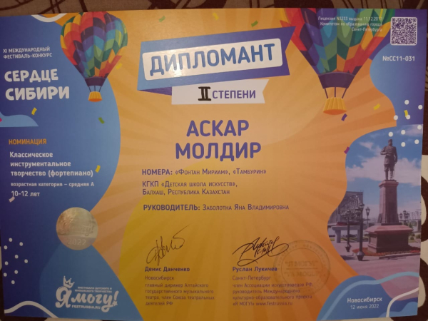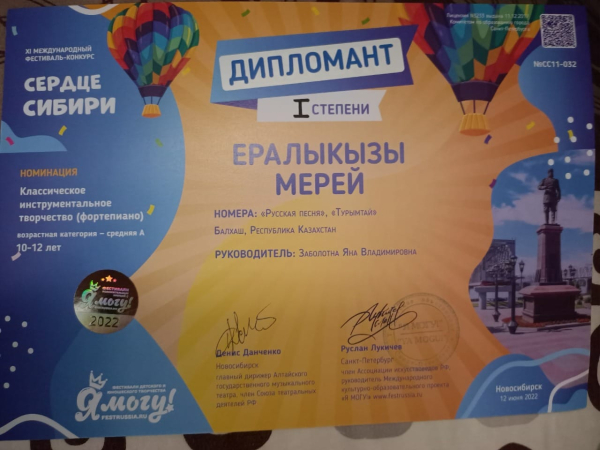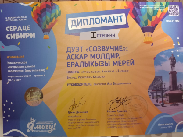 С 11 по 14 июня в г. Новосибирске прошел ХІ Международный конкурс-фестиваль детского и юношеского творчества "Сердце Сибири". Учащиеся класса скрипки педагога Заболотной Я.В. приняли участие в конкурсе, где среди 25 участников разных возрастных категорий стали обладателями диплома 1 степени Ералыкызы Мерей и 2 степени Аскар Молдир в номинации соло и диплом 1 степени в номинации малые формы за дуэт "Созвучие". Участники были награждены медалями и кубками.