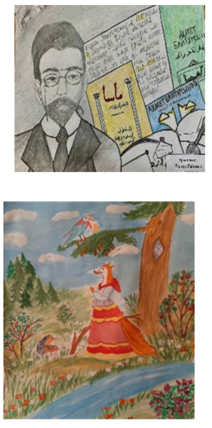 На конкурс были представлены иллюстрационные работы учащихся на стихи Ахмета Байтурсынова «Соловей и осел», «Человек и Медведь», «Письмо маме», книга «Маса» и иллюстрации к переводам «Рыба и рыбак», «Лебедь, щука и рак».