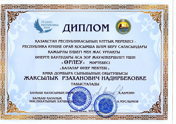 25 қазан Республика күніне орай М.Хамзин атындағы мәдениет сарайында өткен салтанатты жиында мектебіміздің домбыра сыныбының педагогі «Мерей» ансамблінің жетекшісі Надирбеков Ж,Р. Қосымша білім беру саласындағы қажырлы еңбегі мен жас ұрпақты өнерге баулудағы аса зор жауапкершілігі үшін «Өрлеу» мәртебесі номинациясымен марапатталды.