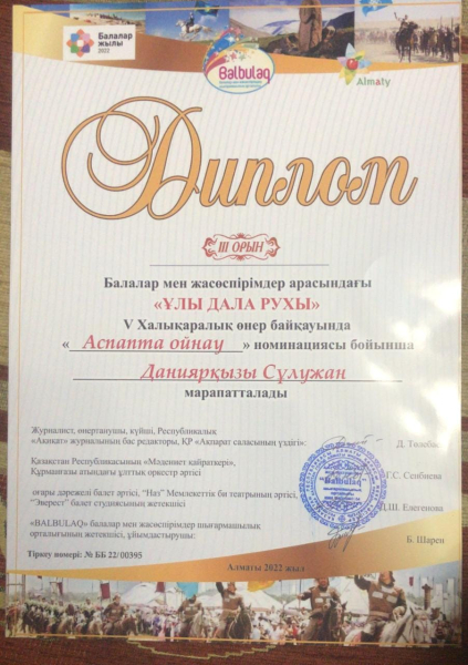 2. Даниярқызы Сұлужан 3 орын. ( пед. Есимова А.Т)