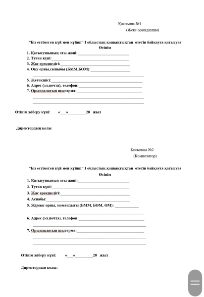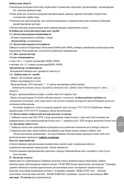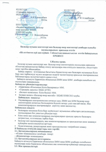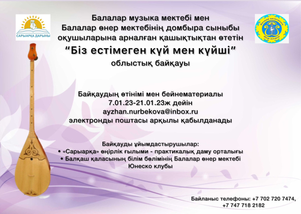Балалар музыка мектептері мен балалар өнер мектептері домбыра сыныбы оқушыларының арасында өтетін "Біз естімеген күй мен күйші" І облыстық қашықтықтан өтетін байқауға қатысушыларды шақырамыз