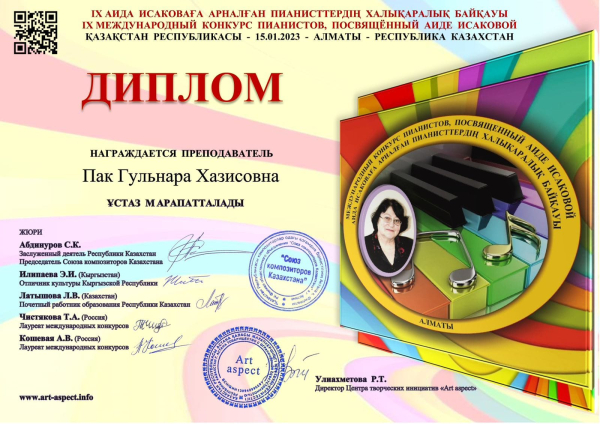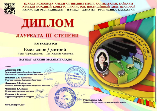 Фортепиано сыныбының 7-сынып оқушысы Дмитрий Емельянов Халықаралық пианистер байқауының III дәрежелі лауреаты атағына ие болды.