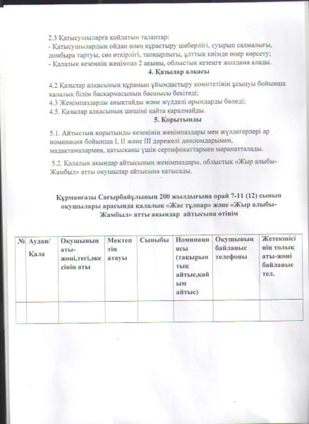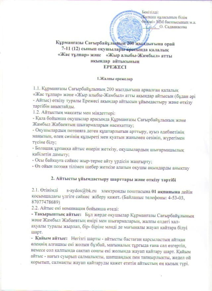 Құрманғазы Сағырбайұлының 200 жылдығына орай 7-11 (12) сынып оқушылары арасында қалалық "Жас тұлпар" және "Жыр алыбы-Жамбыл" атты ақындар айтысына қатысуға шақырамыз