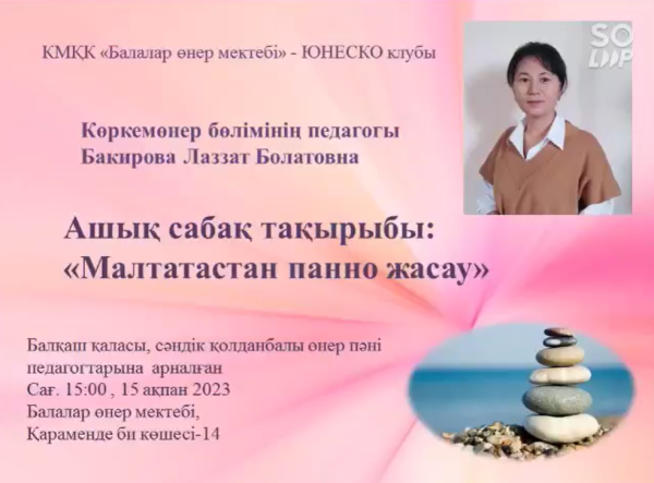 Балқаш қаласының қосымша білім беру педагогтары қауымдастығының жұмыс жоспарына сәйкес 2023 жылдың 15-ші ақпанында «Балалар өнер мектебі» көркемөнер бөлімінің педагогі Бакирова.Л.Б. қала мектептерінің көркемөнер педагогтеріне арналған ашық сабағы өткізілді. Ашық сабақтың тақырыбы «Малтатастан пано жасау» Сабақта Бакирова Лаззат Болатовна осы тақырып бойынша өз тәжірибесімен бөлісті. Сабақ барысында педагог тақырыпты толық ашып, оқушыларды ынталандыра білді. Сабақ соңында шақырылған қонақтар өз пікірлерімен бөлісіп, сабақтың жүйелі өткенін айтып, жақсы оймен тарқасты.