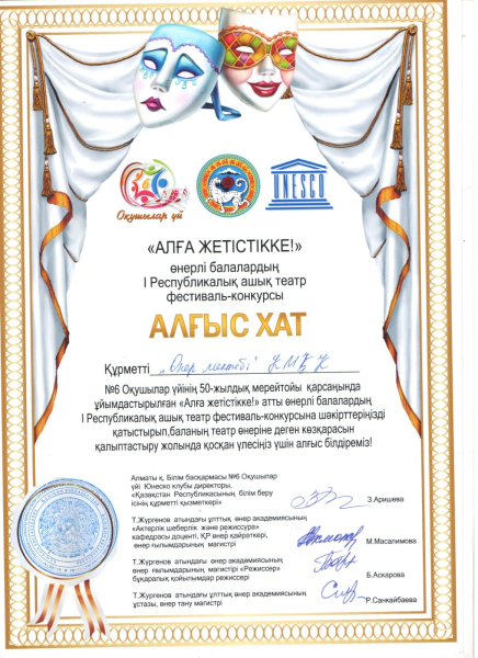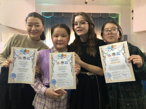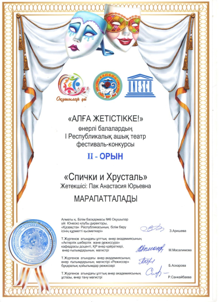 Коллектив "Спички и Хрусталь" театрального отделения КГКП "Детская школа искусств" занял 2-ое место на Первом Республиканском театральном фестивале-конкурсе "Вперед к успеху!", который проходил в городе Алматы 22-25 марта. Из 30 коллективов-участников со всего Казахстана, наши ребята заняли 2-ое место в средней возрастной категории. "Спички и Хрусталь" показывали пьесу Ульриха Хуба "У ковчега в восемь". Руководители: Пак Анастасия Юрьевна и Ибраев Максат Болатович