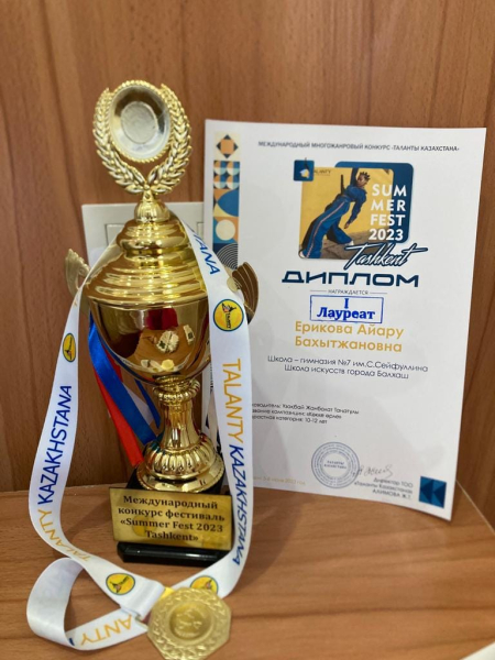 6 маусым күні Ташкент қаласында өткен Халықаралық «Таланты Казахстана» «Summer Fest- 23 Tashkent» фестиваль- байқауына мектебіміздің вокал сыныбының педагогі Ұзақбай Жанболат Таңатұлының 1 сынып оқушысы Ерикова Айару «Көкке өрле» әнімен қатысып, мыңнан жүйрік, жүзден тұлпар атанып, 1 орынды иеленіп қайтты.