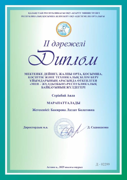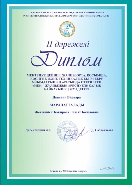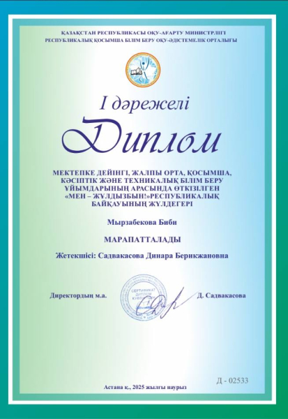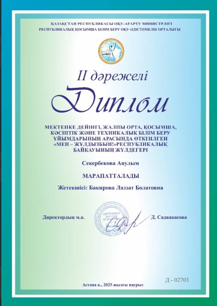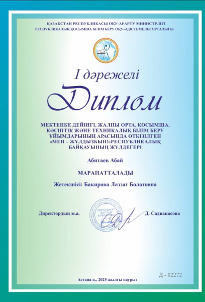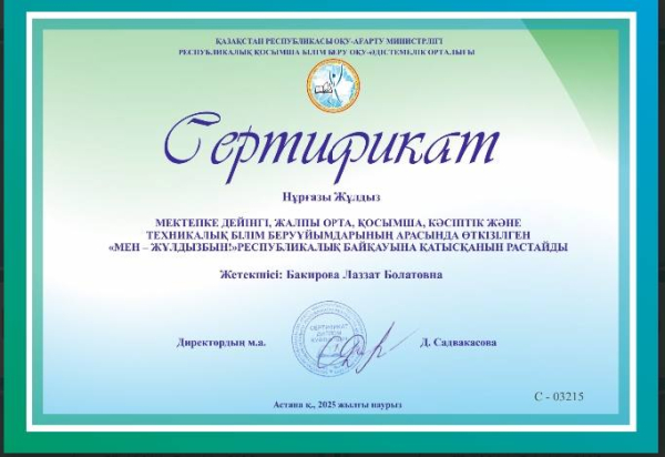 2025 жылғы 17 қаңтар мен 14 наурыз аралығында «Мен – жұлдызбын!» республикалық байқауына көркемөнер бөлімінің оқушыларының онлайн түрде жұмыстары жіберіліп, Мырзабекова Биби 1 дәрежелі диплом (пед. Садвакасова Д.Б), Абитаев Абай 1 дәрежелі диплом, Дымнич Варвара 2-дәрежелі диплом, Секербекова Аяулым 2-дәрежелі, Серікбай Аяла 2-дәрежелі диплом, Нұрғазы Жұлдыз сертификатпен марапатталды.(пед.Бакирова Л.Б)
