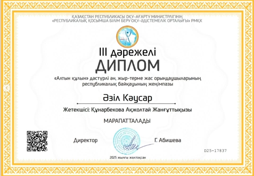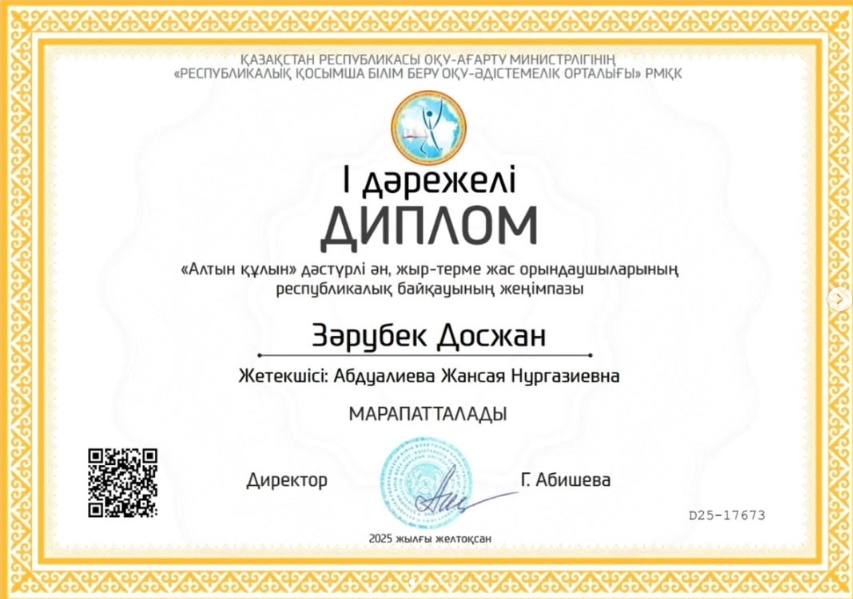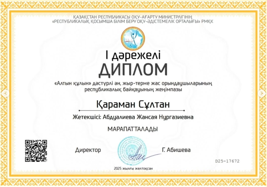 Астана қаласында өткен «Алтын құлын» дәстүрлі ән, жыр-терме жас орындаушыларының республикалық байқауына мектебіміздің дәстүрлі ән сыныбының оқушылары жас ерекшеліктеріне байланысты қатысып, Қараман Сұлтан І орын, пед. Абдуалиева Ж.Н, Зәрубек Досжан І орын пед.Абдуалиева Ж.Н., Ұзақбай Инаят ІІ орын пед.Абдуалиева Ж.Н., Қадыр Ерасыл ІІ орын пед.Жасымхан Н.Т., Әзіл Кәусар ІІІ орын пед.Құнарбекова А.Ж. иеленді!