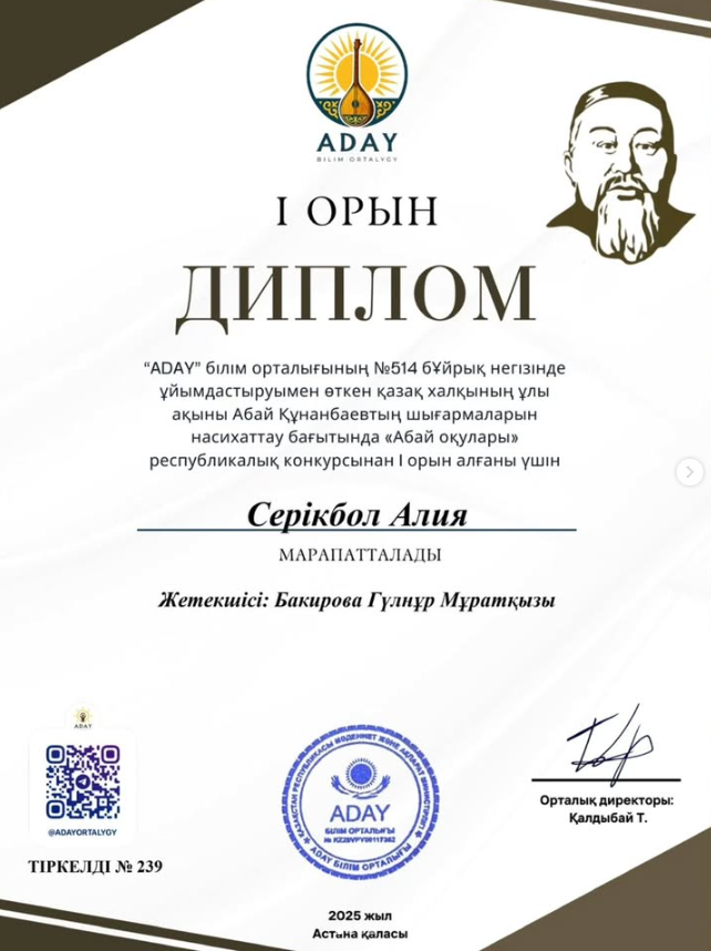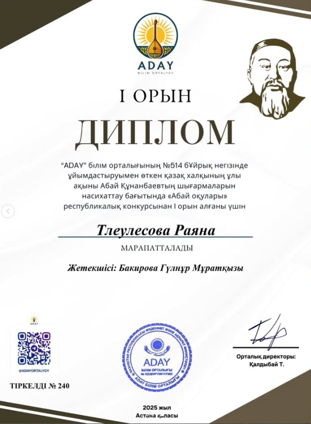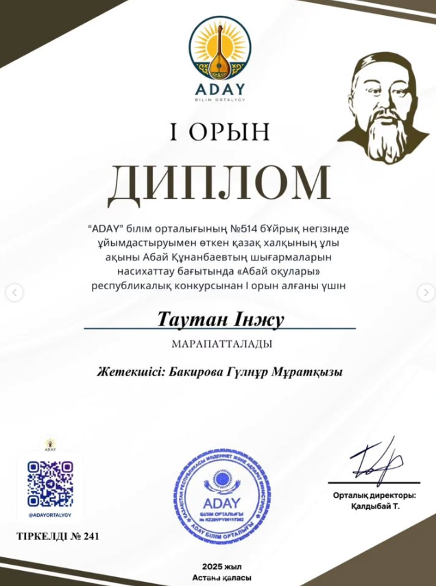 25 желтоқсан күні "ADAY" білім орталығының ұйымдастыруымен өткен Қазақ халкының ұлы акыны Абай Құнанбаевтың шығармаларын насихаттау бағытында «Абай оқулары» Республикалық байқауына мектебіміздің театр бөлімі оқушылары онлайн түрде қатысып, Әлібиқызы Раяна -1 орын, Тлеулесова Раяна-1 орын, Таутан Інжу-1 орын, Серікбол Алия -1орын иеленді. Педагог: Бакирова Гүлнұр Мұратқызы.