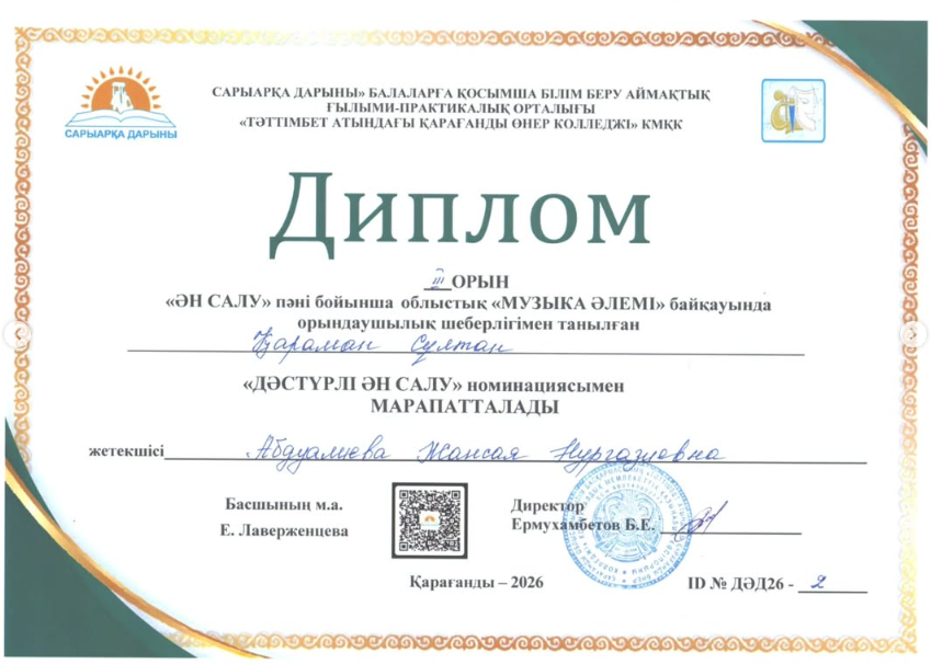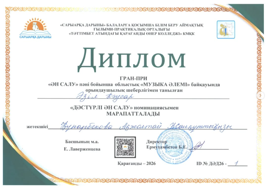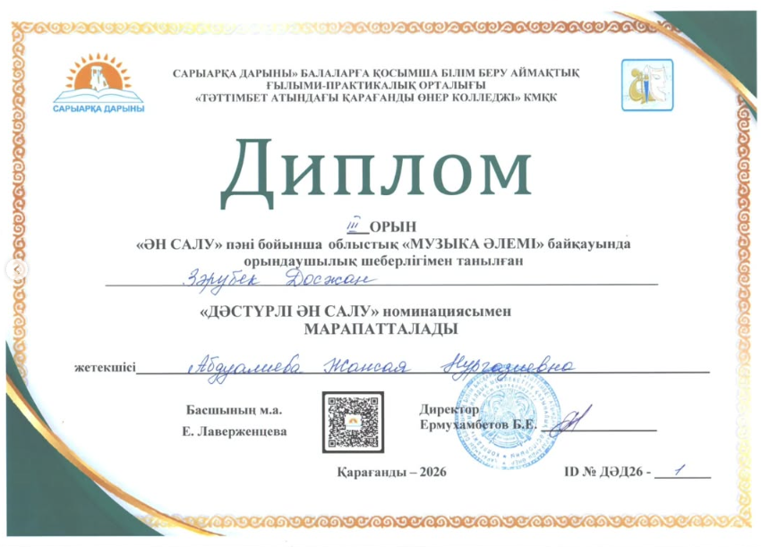 19 Ақпан күні Қарағанды қаласында өткен «Дәстүрлі ән» пәні бойынша облыстық «Музыка әлемі» байқауы БММ, БӨМ, МММИ оқушылары мен ТжКББ, орта білімнен кейінгі білім беру ұйымдарының студенттеріне арналған байқауға мектебіміздің дәстүрлі ән сыныбының оқушылары жас ерекшеліктеріне байланысты қатысып, жүлделі орындар иеленді. Әзіл Кәусар Бас жүлде, педагог: Құнарбекова А.Ж., Қараман Сұлтан 3 орын, Зәрубек Досжан 3 орын, педагог: Абдуалиева Ж.Н.