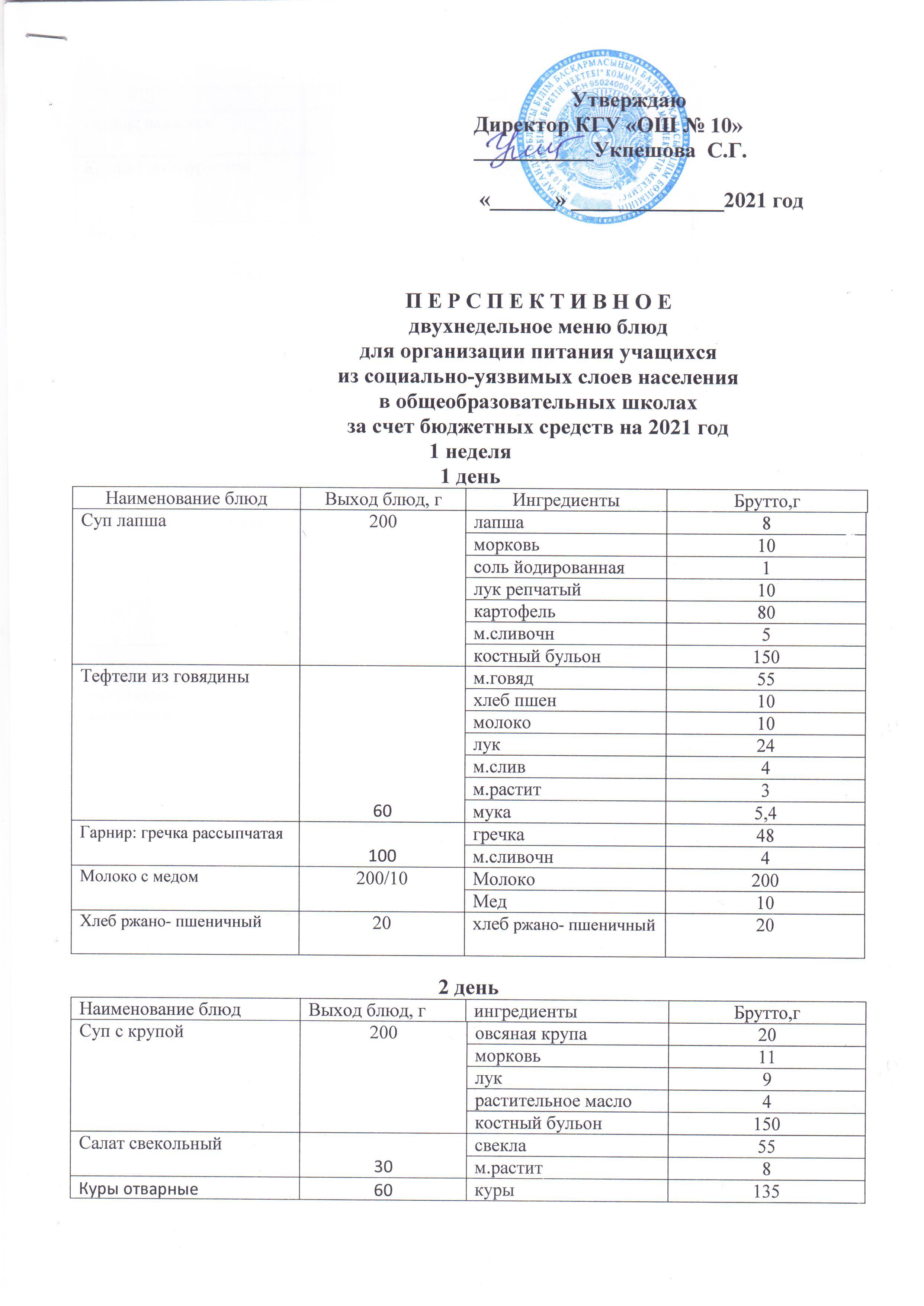 Перспективное двухнедельное меню блюд для организации питания учащихся из социально-уязвимых слоев населения в общеобразовательных школах за счет бюджетных средств на 2021 год