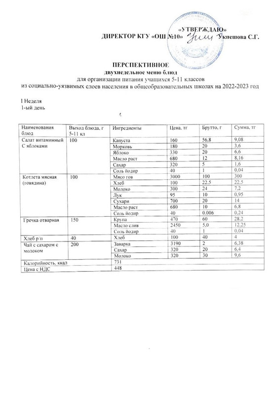Перспективное двухнедельное меню блюд для организации питания учащихся 5-11 классов из социально-уязвимых слоев населения в общеобразовательных школах на 2022-2023 год