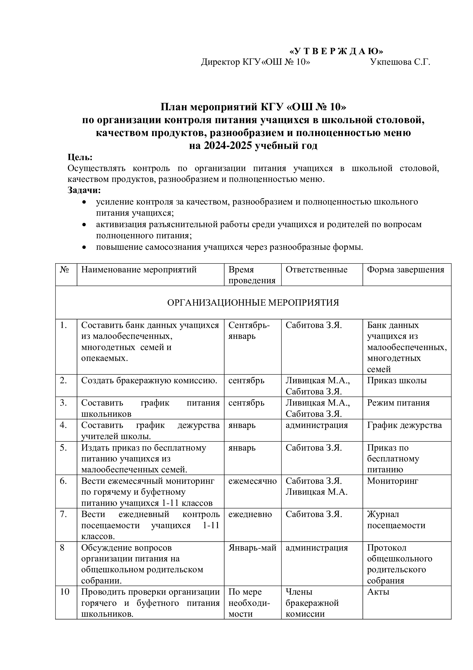 2024-2025 оқу жылына арналған "№10 ЖББМ" КММ мектеп асханасында оқушылардың тамақтануын, азық-түлік сапасын, мәзірдің әртүрлілігі мен толықтығын бақылауды ұйымдастыру жөніндегі іс-шаралар жоспары