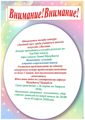 Обьявляется онлайн конкурс "Звёздный час" среди учащихся школы искусств г.Балхаш. Конкурс проводится в онлайн режиме по YouTube каналу.