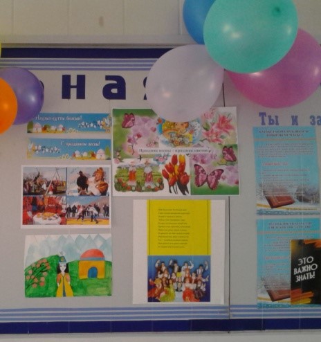 Мектеп іші мерекеге қарсы әдеміленді: фойені түрлі- түсті ленталармен көмкерілген шаңырақ көркейтті, бағандар Наурыз символы-қызғалдақтармен безендірілді.