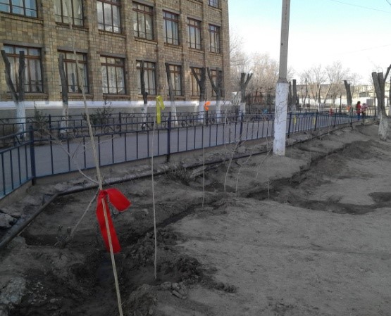 Группа учащихся 9-х классов- активистов школы, под руководством преподавателя НВП Кочеткова Л.Г. и председателя Совета отцов «Отцовское плечо» Русских А.С., работали на школьном дворе: вскопали землю, подготовили ямы, удобрение, воду для посадки молодых саженцев на аллее «Астана – арман кала!», посвященной 20 – летию Астаны. Активисты школы повязали на саженцах разноцветные ленточки. За саженцами закреплены классы, которые будут ухаживать за ними.