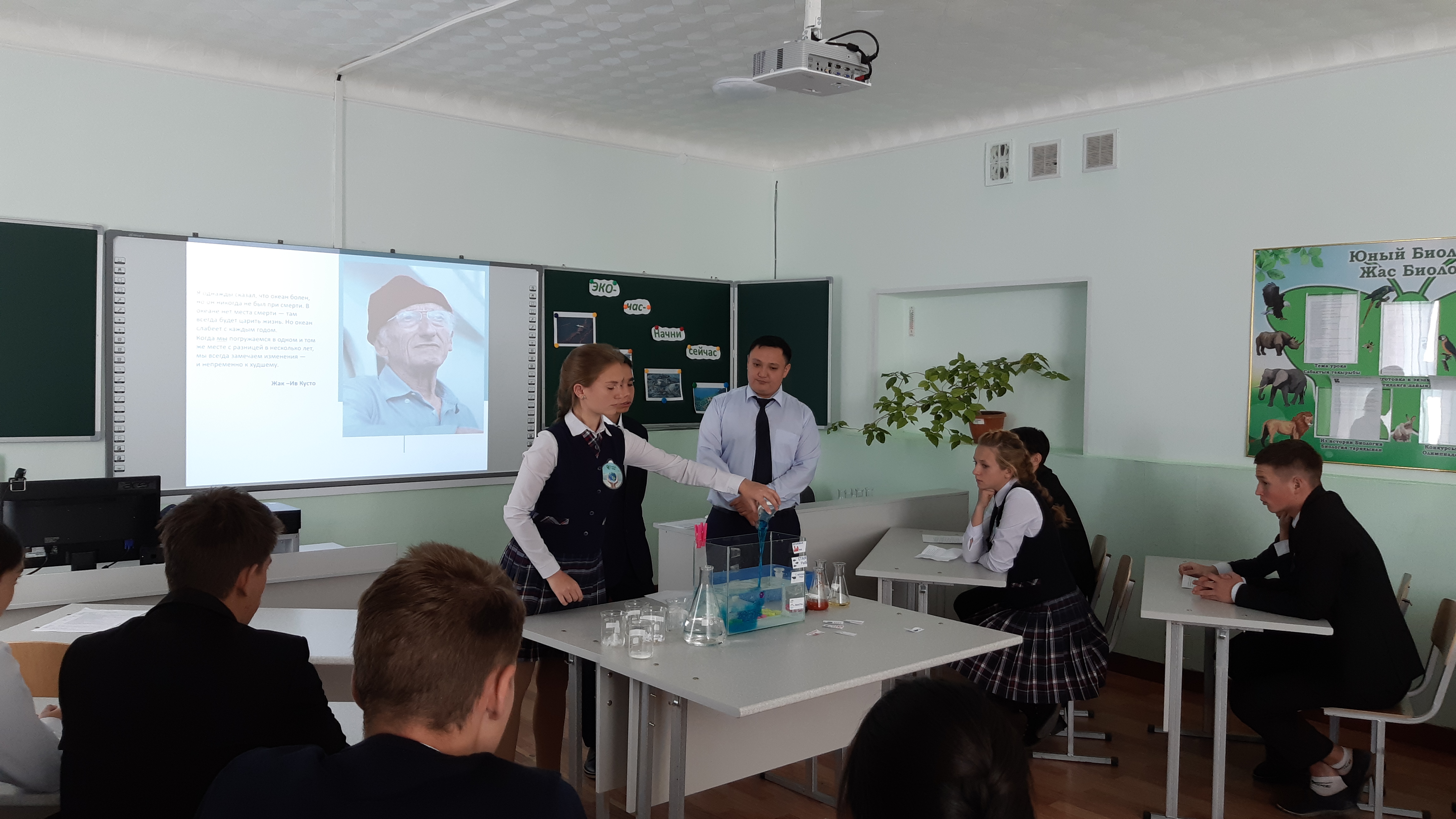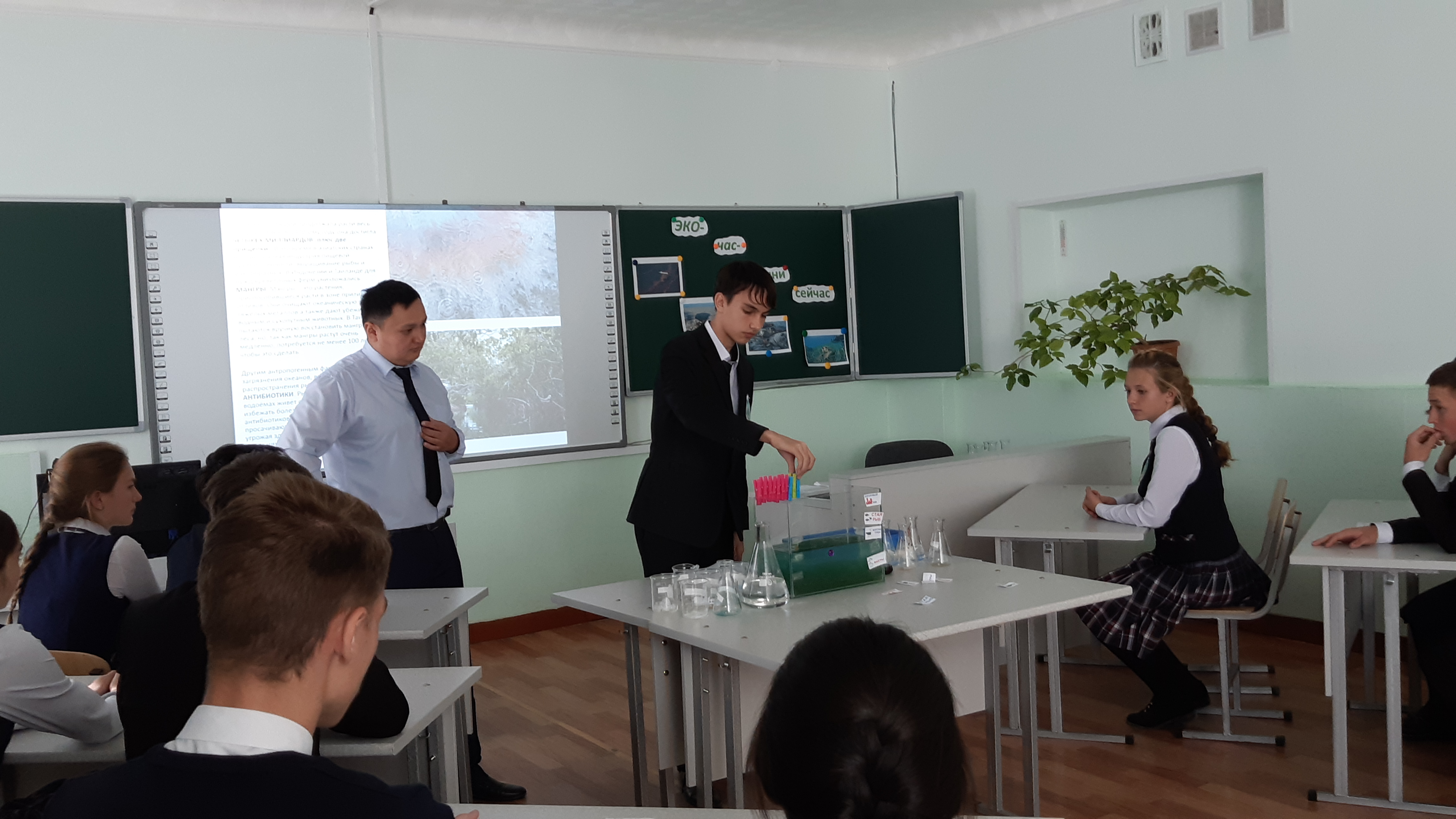 В 12.00 начался во всех классах экочас. Классные руководители использовали видеоролики о планете Земля. Открытый экочас был проведен в 10 классе учителем географии Сауриковым О.А., при участии классного руководителя Базарбековой С.Б.. Ребята вместе с учителем рассмотрели экологические проблемы Мирового океана. Наглядным примером загрязнения вод океана стало практическое занятие, которое в процессе часа выполнили все учащиеся класса. Также десятиклассники выступили с предложениями: Как спасти океан от загрязнения. На экочасе были рассмотрены проблемы и нашего озера Балхаш. Завершился экочас просмотром видеоролика о Мировом океане и его проблемах.