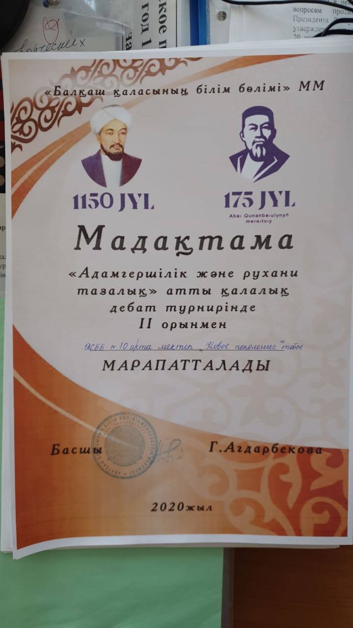 16 января, в рамках мероприятий, посвященных 1150-летию Аль-Фараби и 750-летию Абая в городе Балхаш прошел дебатный турнир "Адамгершілік және рухани тазылық". Честь нашей школы защищала команда "Новое поколение" в составе: 1 спикер - Чурикова Арина, 2 спикер- Огай Никита, 3 спикер - Сунгатуллин Никита. Тренер - Ледовская Татьяна Владимировна. Команда заняла 2 место!