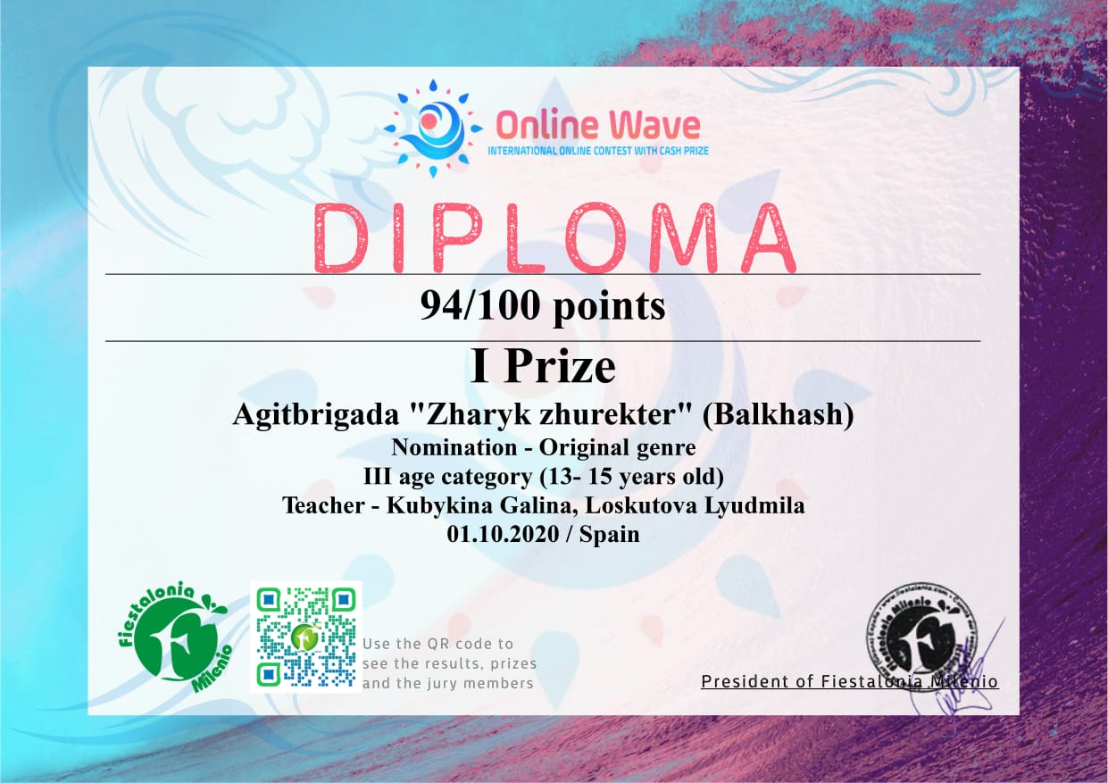 The International Distance Competition "Online Wave" from the Spanish Festival Committee has established itself as one of the most popular and largest venues for online festivals in the world. The international jury consisted of leading cultural figures and critics from 5 countries. In September 2020, the well-known dance group "Dens-class" (Loskutova L. V.) and the propaganda team "Zharyk zhurekter" (head Kubykina G. V.) of secondary school # 10 Balkhash" took part remotely in this large-scale event. On October 2, 2020, on the eve of Teacher's Day, the results of participation came, which made the teaching and student staff of the school happy.