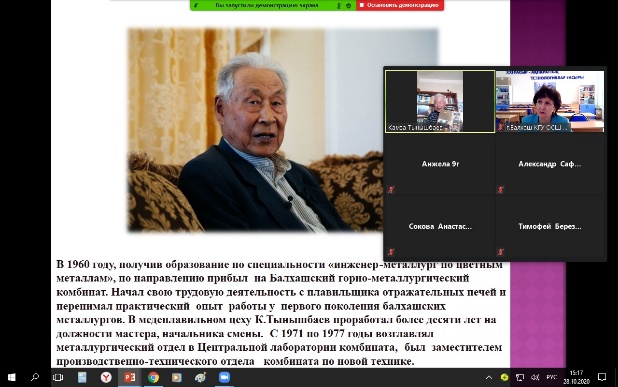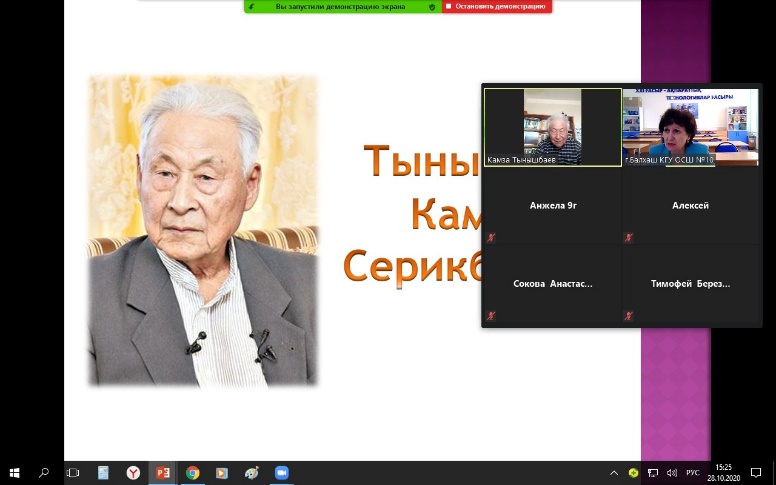 В рамках реализации программы «Рухани жаңғыру» и проекта «Өнегелі өмір» 28.10 2020 года в КГУ «ОСШ №10 г. Балхаш» была проведена встреча «Медных дел мастер» с Почетным металлургом СССР, почетным жителем города Балхаш Тынышбаевым Камзой Серикбаевичем.