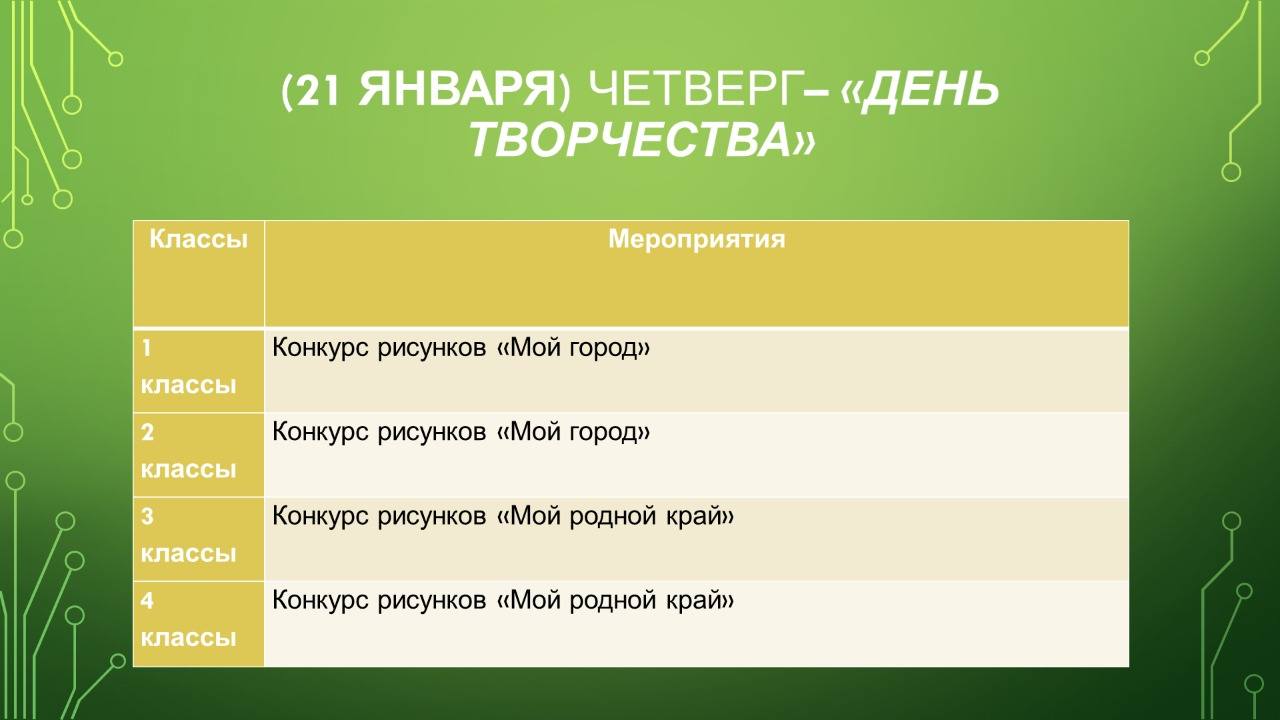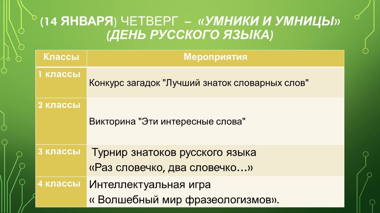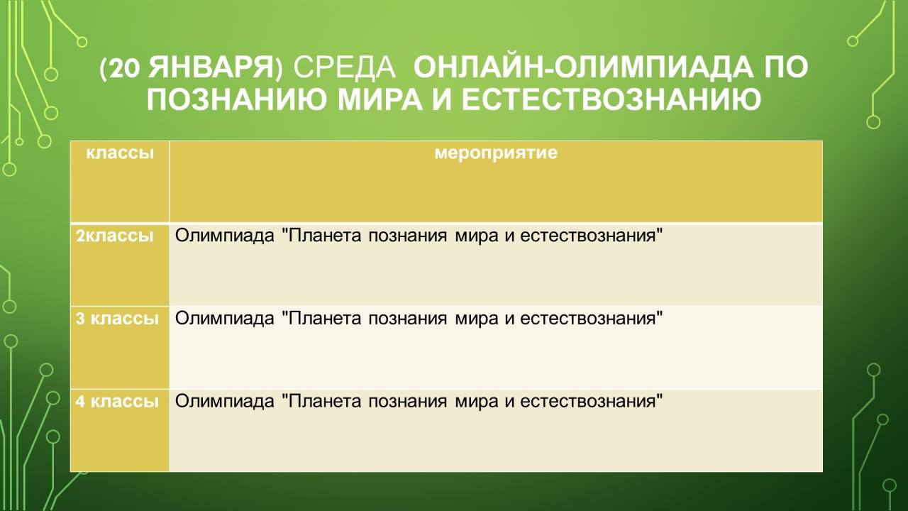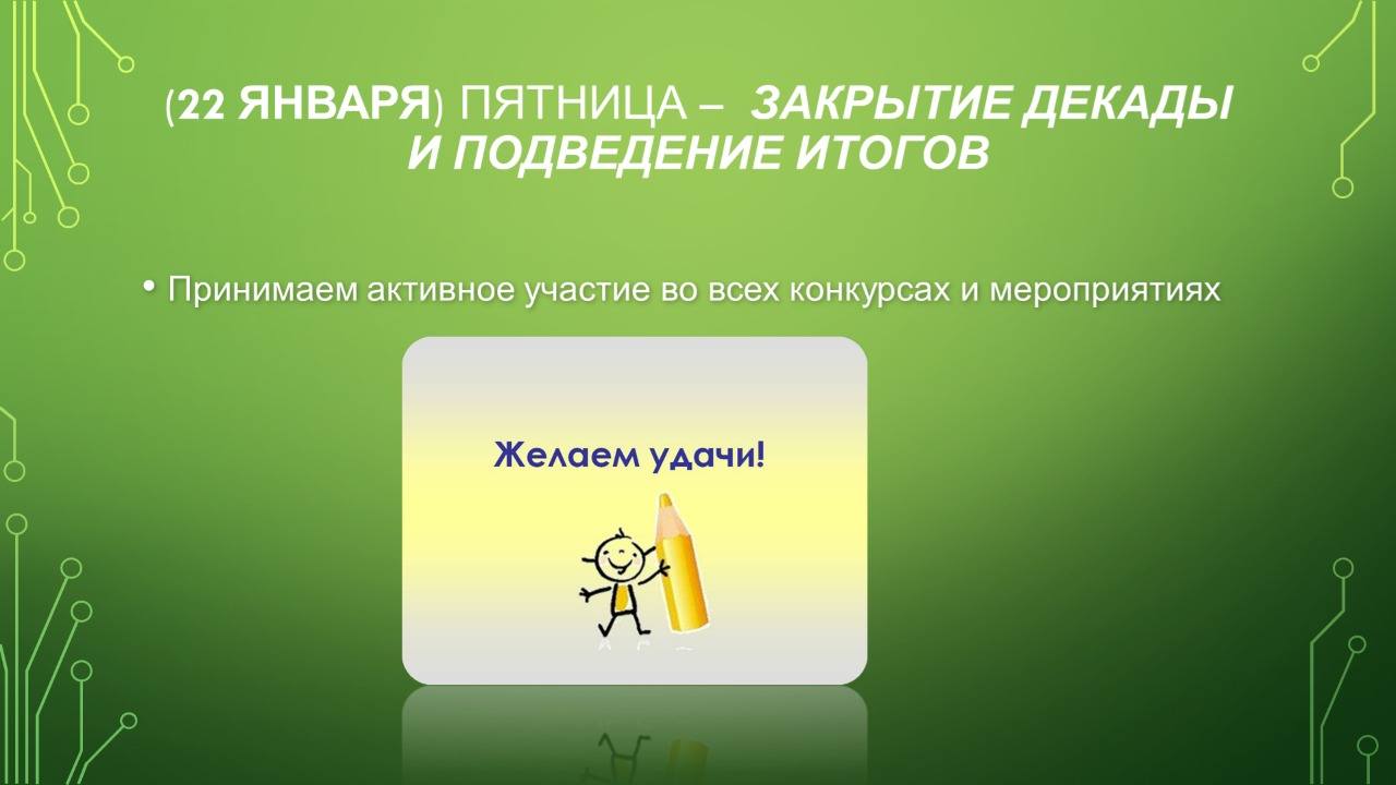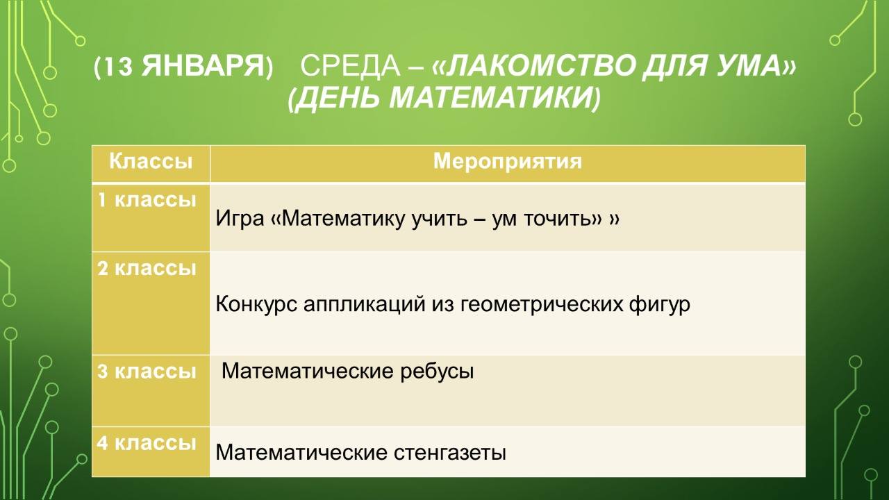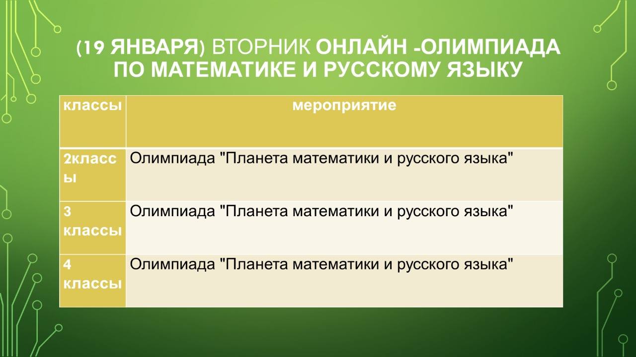 С 11.01.2021 года стартовала декада начальных классов. На каждый день запланированы мероприятия по параллелям классов с 1 по 4. Мероприятия направлены на развитие логического мышления, творческих и интеллектуальных способностей детей. Дети активно принимают участие.