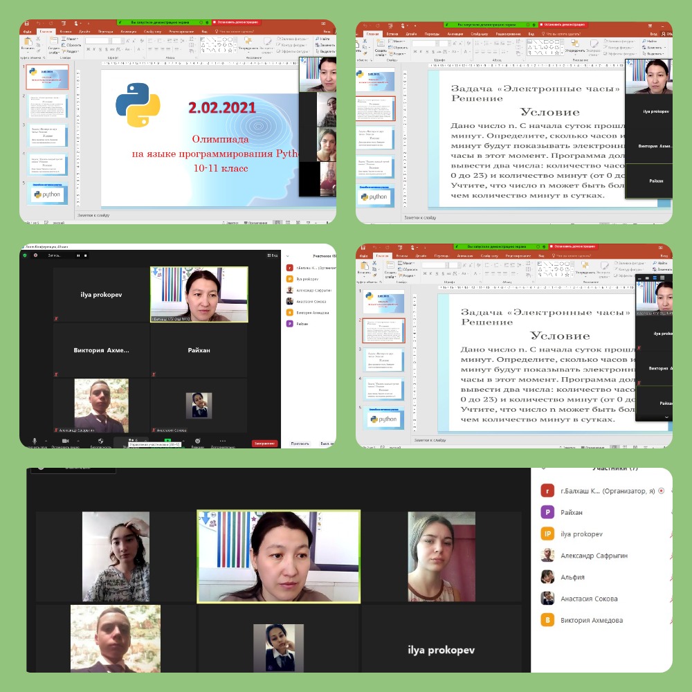 С целью формирования более глубоких знаний учащихся в области информатики и на языкепрограммирования Python было организовано олимпиада среди учащихся 10-11 классов. Максимальное количество баллов набрал ученик 10 го класса Сафрыгин Александр который занял 1 место. 2 место досталось Ахмедовой Виктории, а 3 место заняла ученица 11 класса Өмірбай Райхан.