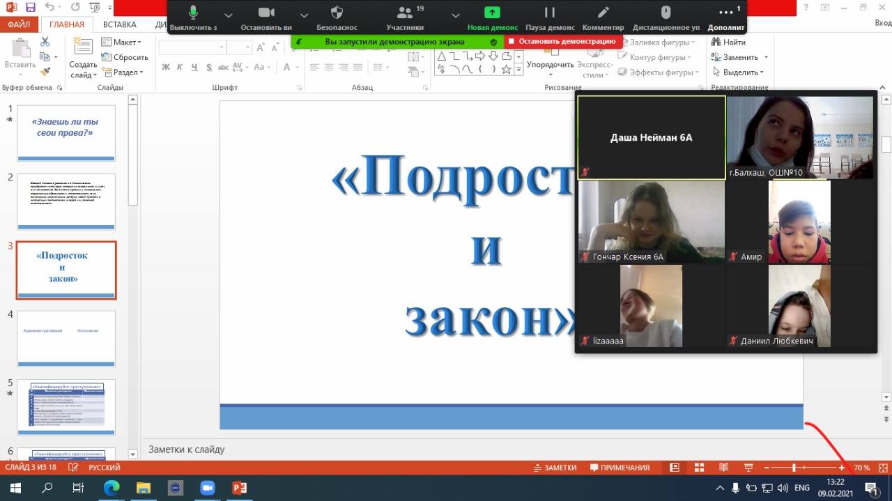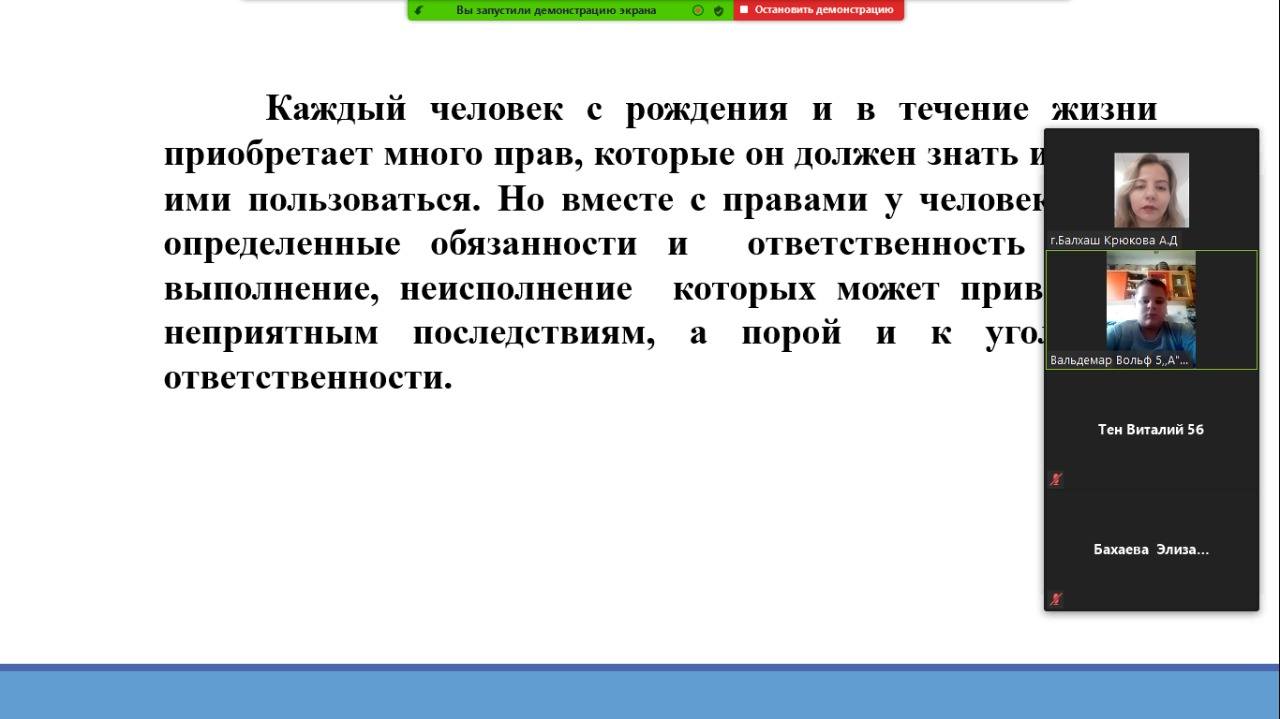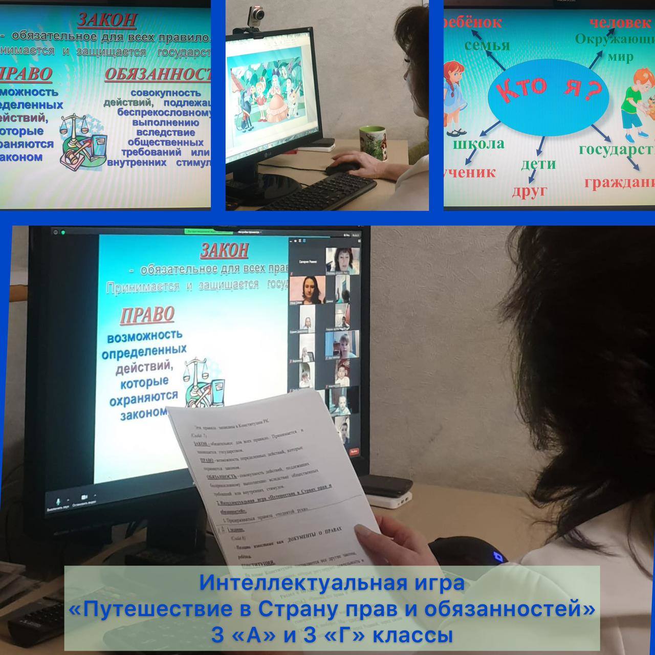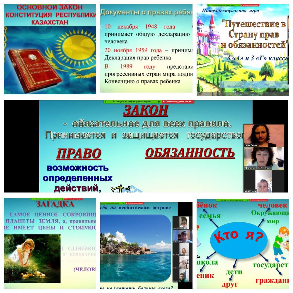 Құқықтық сауаттылық апталығы шеңберіндегі іс-шаралар циклін жалғастыра отырып, 3 "А" және 3 "Г" сыныптарының сынып жетекшілері М.А. Ливицкая мен Н.А. Семак "құқықтар мен міндеттер еліне саяхат"зияткерлік ойынын өткізді. Ойын ZOOM платформасында онлайн режимінде өтті. Оқушылар азамат болу дегеннің не екенін біліп, міндеттерсіз құқықтар жоқ деген қорытындыға келді, "заң", "құқық", "міндет"ұғымдарының мәнін ашты. "Еркін микрофон" стратегиясында "Менің құқығым бар, бірақ мен..." деген сөздерді құруды үйрендім. Рөлдер бойынша ойнау және проблемалық жағдайларды талқылау, "Лайк-Дизлайк" ойыны үлкен қызығушылық тудырды - " Бала құқықтары туралы Конвенцияның мазмұнын білесің бе?", "ертегілер беттерінен" ойыны-құқықтық викторина, " әр символдың өз қолы бар!». Ойын аяқталды, бірақ" құқықтар мен міндеттер еліне саяхат " біздің балаларымыздың мемлекетіміздің нағыз азаматтары және патриоттары болуы үшін жалғасуы керек.