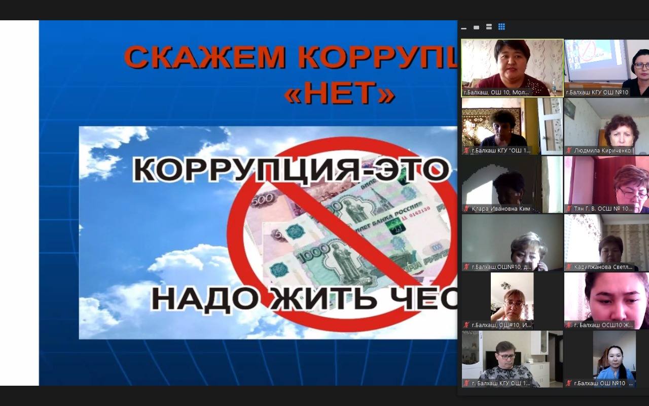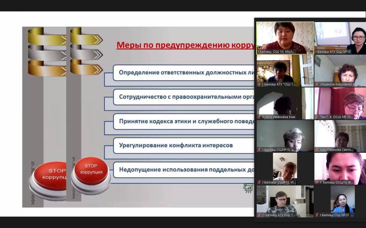 Құқықтық жалпы оқыту шеңберінде педагогикалық кеңестің отырысында "сыбайлас жемқорлықтың, сыбайлас жемқорлық құқық бұзушылықтардың және олар үшін жауапкершіліктің алдын алу"мәселесі қаралды. Әріптестерінің алдында мектептің кәсіподақ комитетінің төрайымы Г. К. Молдабекова сөз сөйледі. Сыбайлас жемқорлық-бұл жай ғана қылмыс емес, сонымен бірге экономиканың дамуының да, елдің саяси жүйесінің жұмыс істеуінің де көрсеткіші. Жас ұрпақты тәрбиелеуде мұғалімдер қоғамға таза қызмет етудің жарқын үлгісі болуы керек.