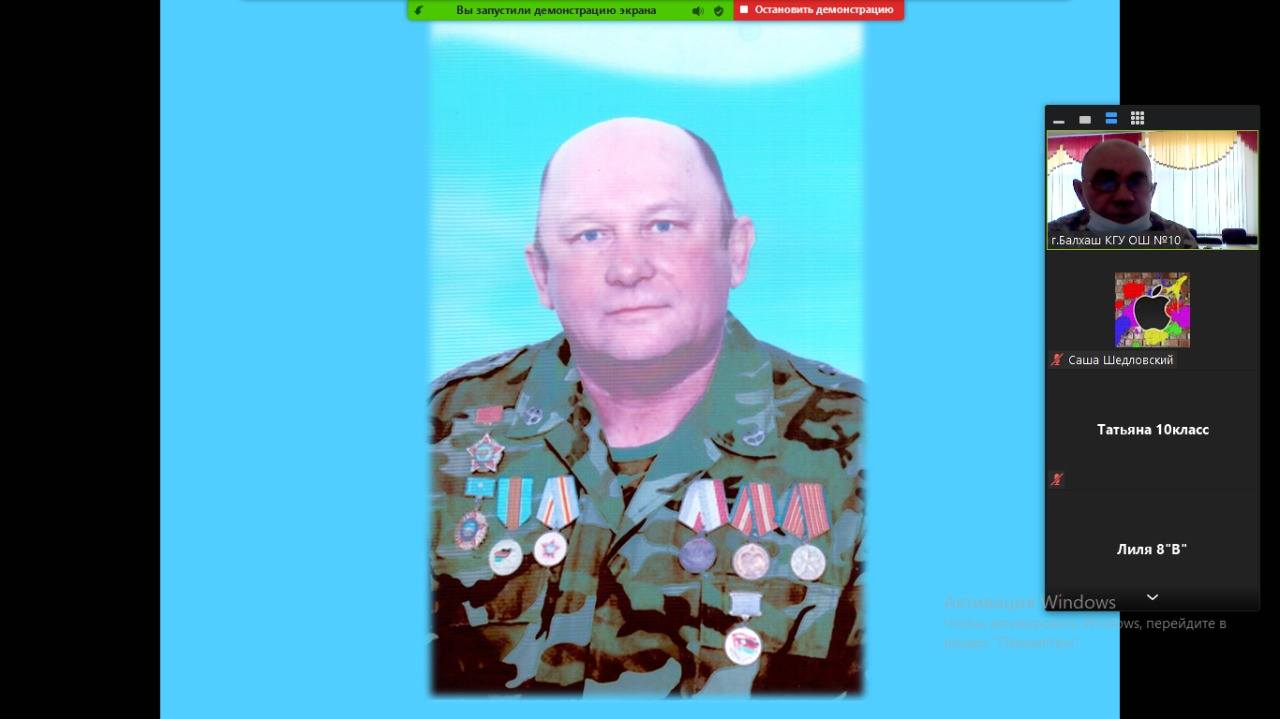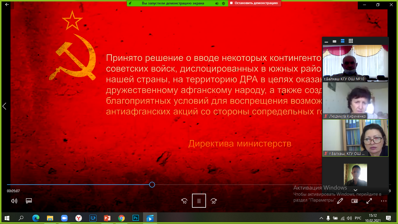 2021 жылдың 10 ақпанында «Балқаш қаласының №10 ЖББМ»КММ Ауғанстаннан Кеңес әскерлерін шығару күніне арналған 8-11 сынып оқушыларының қатысуымен онлайн режимінде іс-шара өткізілді. Іс - шараны НВТП педагог-ұйымдастырушысы Кочетков Л. Г. ашты. Леонид Германович өз сөзінде Ауғанстанда соғысқан ұлдар мен қыздардың ерлігіне арналған бұл күн жыл сайын атап өтілетінін айтты. Ауған жауынгерлерінің арасында балқаштықтар да бар. Талғат Балқыбеков пен Игорь Миглазов – біздің мектептің түлектері, Ауғанстандағы ұрыс қимылдарының қатысушылары. Олар жігіттерде қонақта болады, жолдастар туралы, мықты сарбаздар достығы туралы естеліктерімен бөліседі. Директордың тәрбие ісі жөніндегі орынбасары Людмила Владимировна Кириченко қаладан келген екі баланың әскери борышын өтеп, өз өмірлерін қиғанын айтты. Олар: Шығыс Қоңырат кенті №18 ОМ түлегі Нұрғалиев Самат және Балқаш қаласы №16 ОМ түлегі Анатолий Антонов. Олар туралы естелік жас ұрпақтың жүрегінде өмір сүреді және өмір сүруі керек, ол жас кезінен бастап өзін қасиетті парызды – Отанды қорғауға дайындауы керек. Қазақстанның басты құқықтық Заңы – ҚР Конституциясы туралы, онда Отанды қорғау әрбір азаматтың қасиетті борышы екені жазылған, деп хабарлады директордың орынбасары Ридель Людмила Юрьевна. Ол оқушыларды жақсы оқуға, спортпен шұғылдануға, өз Отанын сүюге және әскери борышын өтеп, тірі үйге оралмаған адамдарды еске алуға шақырды. Оқушылар «Ауған соғысы: себептері, кезеңдері, қорытындылары» атты бейнефильмді тамашалады.