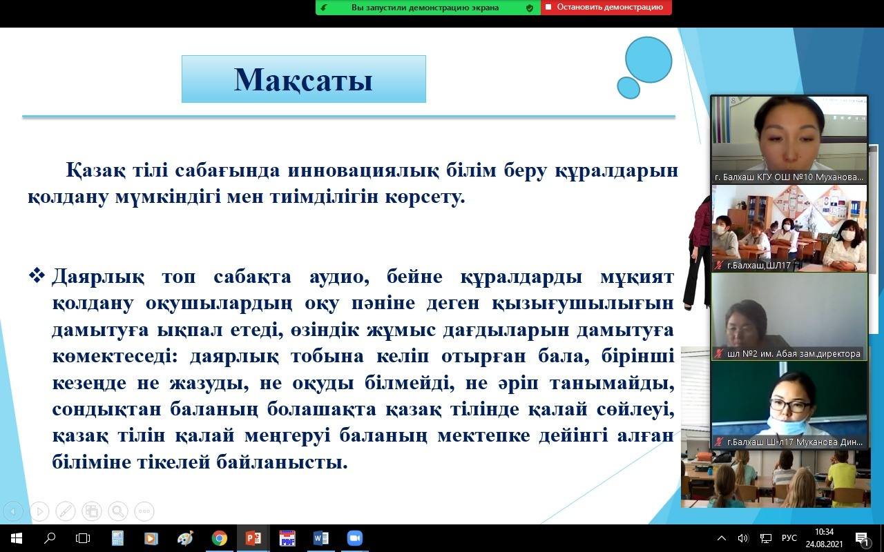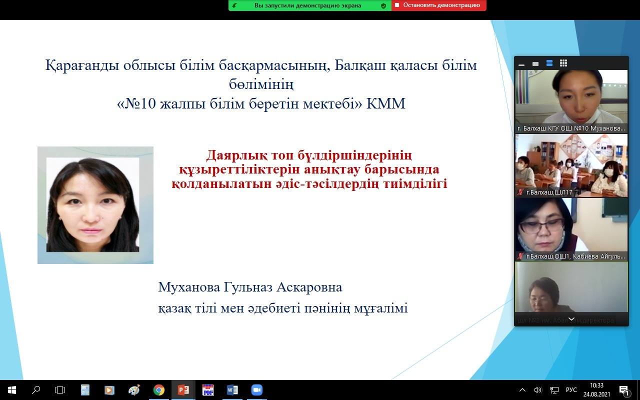 Қазақ тілі мұғалімдерінің секциялық отырысында Муханова Гүлназ Асқарқызы өз тәжірибесімен бөлісті. Ол оқыту мен оқытудың қандай әдістері мен тәсілдері кішкентай оқушыларды қазақ тілін үйренуге қызықтыратыны туралы айтты.
