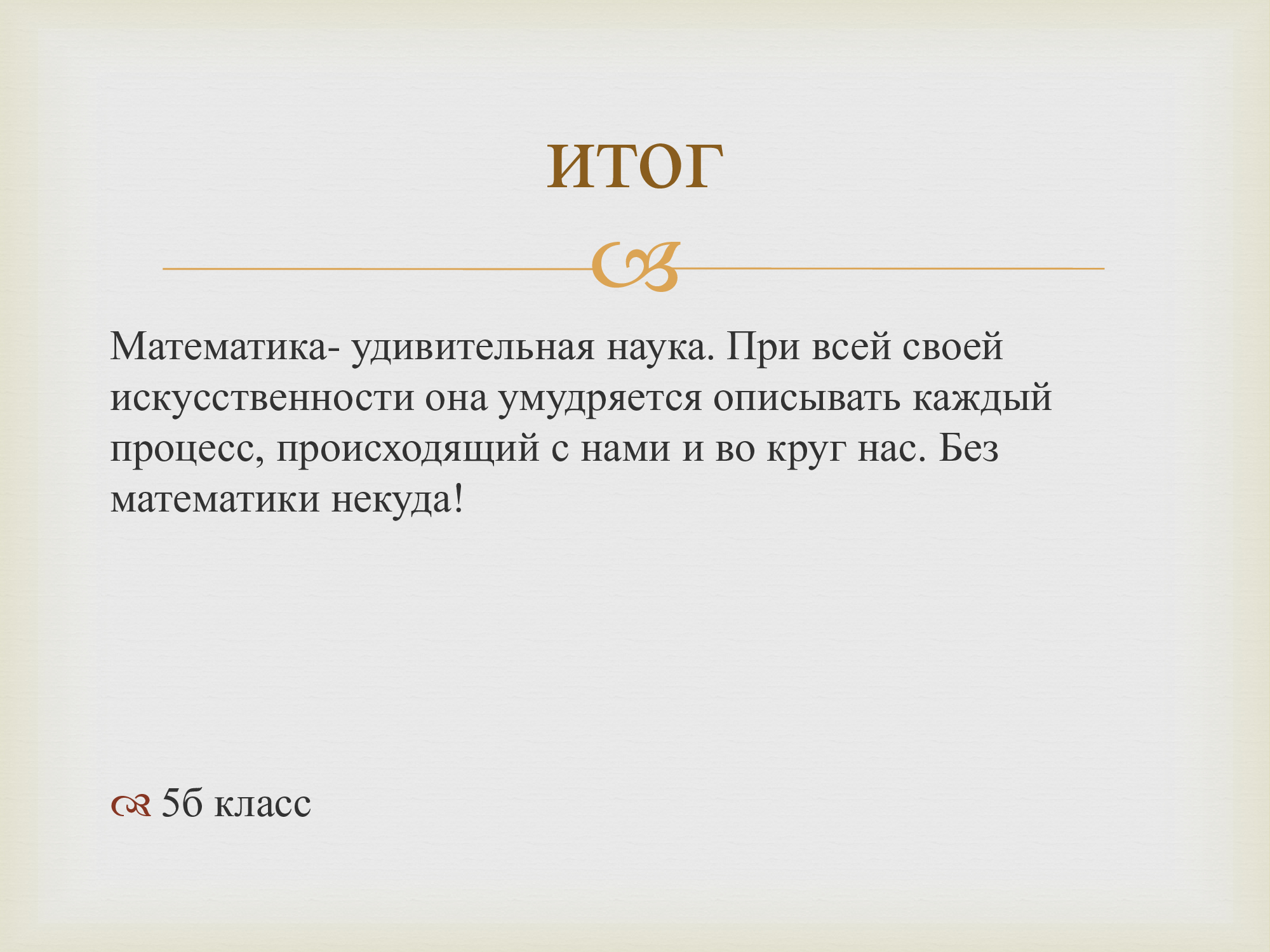 Қарым-қатынас сағаттары әртүрлі және қызықты түрде өтті. Балалар есептерді өлеңмен шешіп, математикалық есептер мен ребустар шешті. Балалар ұйымдасқан, тәртіпті және белсенді болды. Сынып сағаты барысында балалар математиканың адам өмірінде қай жерде кездесетінін және оның мәні неде екенін талдап, мысалдар келтірді. Математика ғылымы қашан және қашан пайда болды деген мәселелер де шешілді. Ұлы математиктермен, олардың математика саласындағы жаңалықтары туралы танысты. Біздің өмірімізде математика не үшін қажет екенін білдік. Сынып сағаты эмоционалды болды. Қойылған міндеттерді толық жүзеге асыру мүмкін болды. Сынып сағатының тақырыбы сабақтан тыс уақытта байқалды.