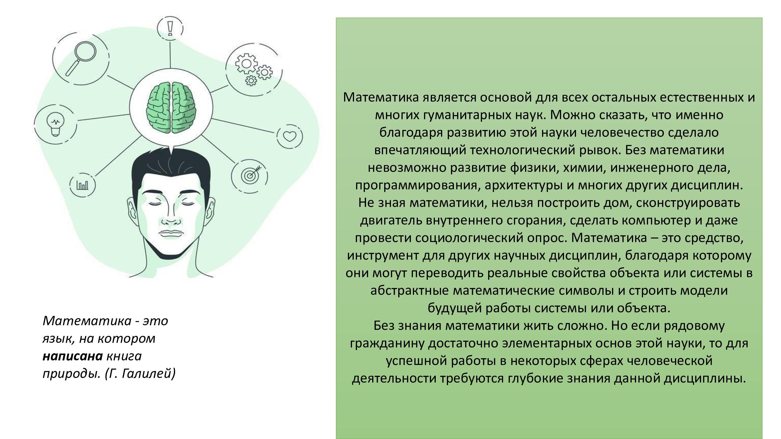 С целью формирования математической культуры, активизации познавательной деятельности в области математики, открытие недели Математической грамотности началось с проведения часов общения на классных часах. В 1 - 11 классах прошли классные часы по теме «Математика в жизни человека». На классном часе классные руководители