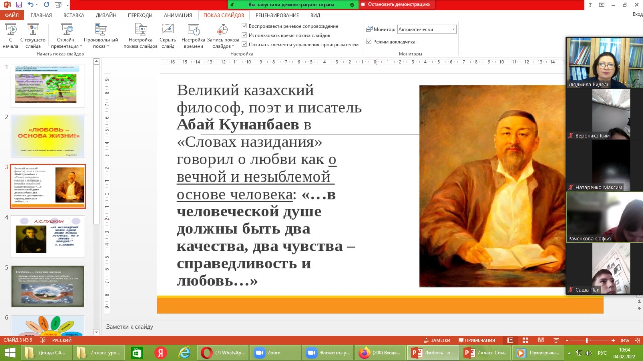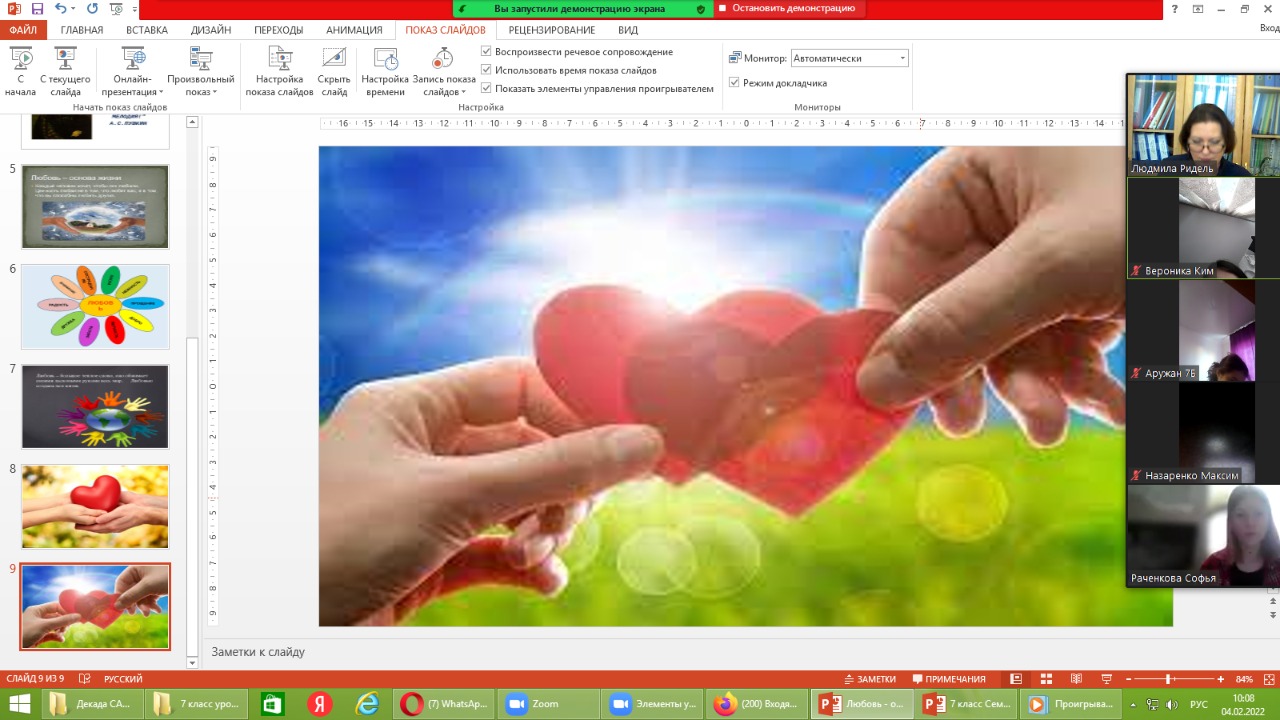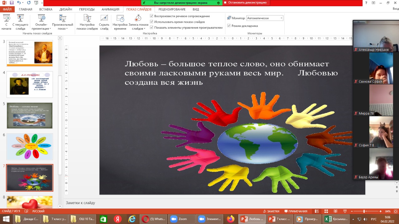 С 1 по 11 февраля 2022 года в нашей стране проводится традиционная Декада самопознания на тему «Жизнь во имя любви». В рамках проведения Декады в КГУ «Общеобразовательная школа №10» 4 февраля 2022 года прошли беседы с учащимися 7 классов на тему «Любовь – основа жизни». Любовь – основа жизни. Все живое на планете наделено этой энергией. Любовь можно дарить не только тому, кто находится рядом, но и тому, кто находится далеко от вас, кто живет в другом городе или на другом конце нашей планеты, потому что у любви нет границ. Вместе с учителем самопознания Ридель Людмилой Юрьевной ребята говорили о том, что Любовь – это чувство, которое наполняет особым смыслом жизнь человека, о том, как хорошо уметь любить и дарить любовь всему миру. Любовь – это могущественная и великая сила жизни!