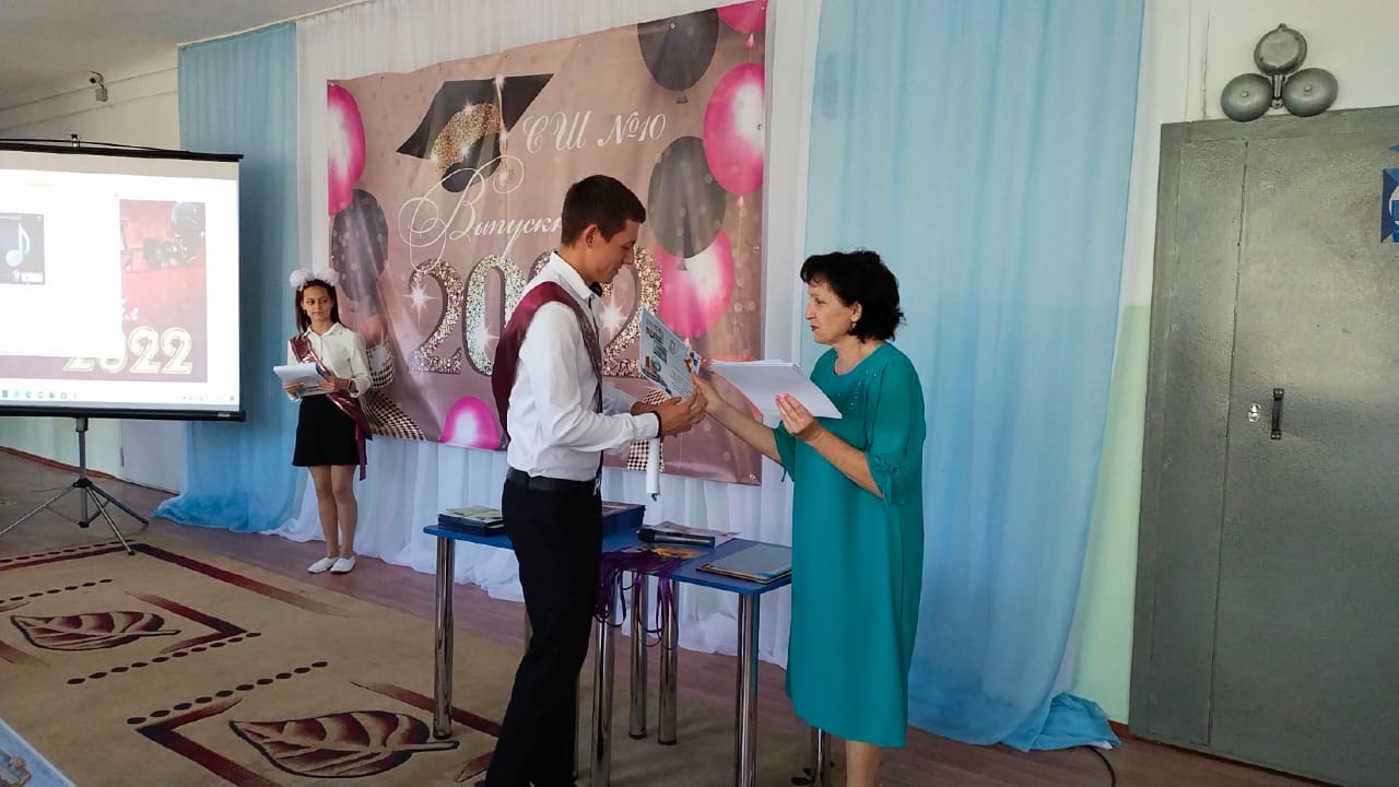 Всем выпускникам были вручены памятные дипломы, которые будут напоминать им, что они учились в школе №10 и выпускались из ее стен в Год детей, а также медали по номинациям. Наступил торжественный момент.Аттестаты о среднем общем образовании выпускникам 2022 года вручили директор Сауле Газисовна и заместитель директора Людмила Юрьевна.