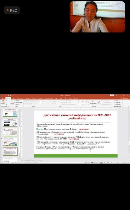 Бүгін, 2022 жылдың 26 тамызында, білім беру қызметкерлерінің тамыз педагогикалық конференциясында информатика пәні мұғалімдерінің секциялары арасында біздің мұғалім Смакова Айгерим Бекболатовна мектепте информатика пәні бойынша облыстық, қалалық жобаларды іске асыру бойынша жұмыстың қалай өткендігі туралы айтып берді. Әйгерім Бекболатқызы өз сөзінде мұғалімдердің де, оқушылардың да жетістіктері туралы айтып берді.