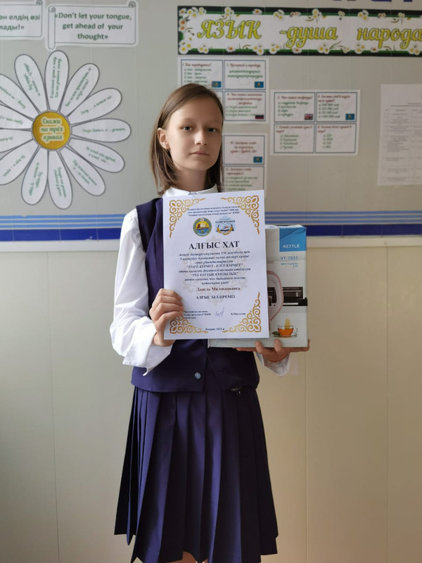 6 сентября прошел городской конкурс сочинений «Тіл-ұлттық құндылық», который проводил Центр языков города Балхаш. Данный конкурс был посвящен Дню языков народов Республики Казахстан и 150-летию Ахмета Байтурсынова. В этом конкурсе приняла участие наша ученица 7 «Б» класса Миловацкая Данель. И по результатам конкурса Данель была награждена грамотой Алғыс хат и ценным призом.
