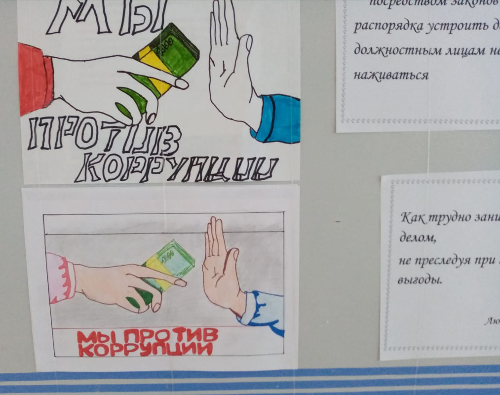 Согласно плану работы, посвященного Международному дню борьбы с коррупцией в школе был проведен конкурс плакатов «Стоп – коррупция!», в котором приняли участие художники 7-9 классов. Плакаты получились яркими, содержательными, аккуратно выполненными! Все участники конкурса награждены грамотами! Учащиеся 5,6 классов не остались в стороне от участия в борьбе с коррупцией: свой протест против этого зла, ребята выразили с помощью рисунков по теме «Коррупция глазами детей!». Плакаты и рисунки был представлены на выставке «Мы вместе – против коррупции!».  Представителями школьного парламента вместе с соцпедагогом был проведен социальный опрос «Коррупция и меры борьбы с ней» среди педагогов, сотрудников и учащихся школы. Результаты опроса показали, что в нашей школе нет места проявлениям коррупции: все знают, что коррупция – это преступление и, что с ней нужно всем бороться!