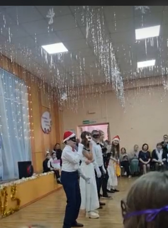 Праздник проходил в украшенном зале,у новогодней елки и начался с «Новогоднего Вальса учащихся».
