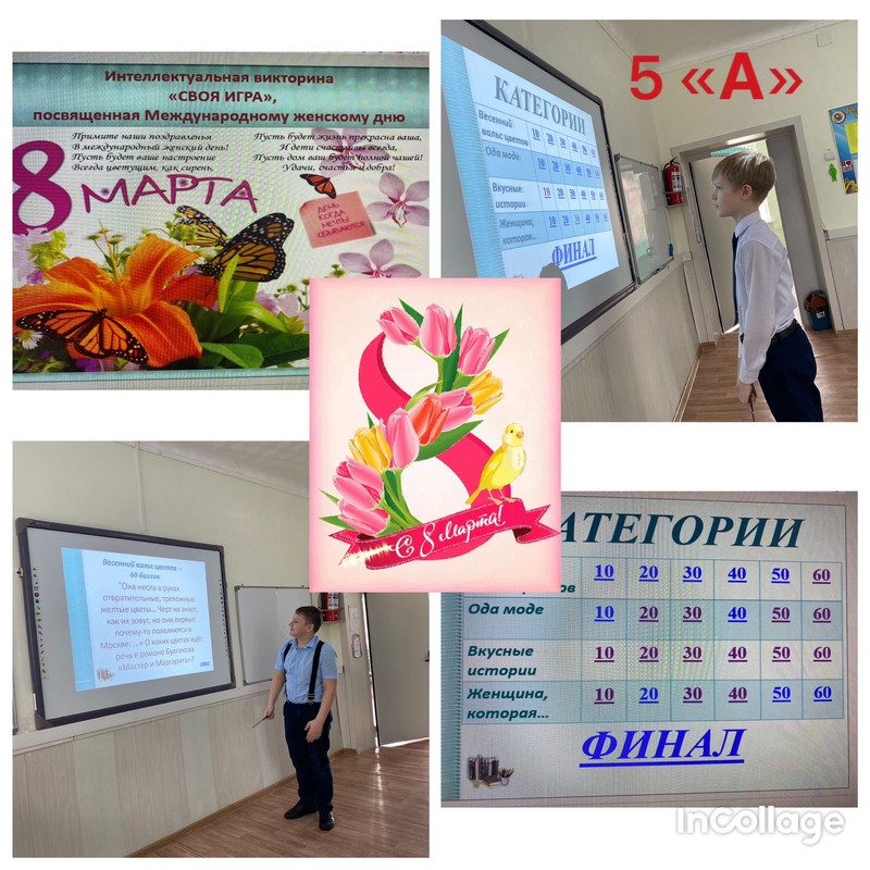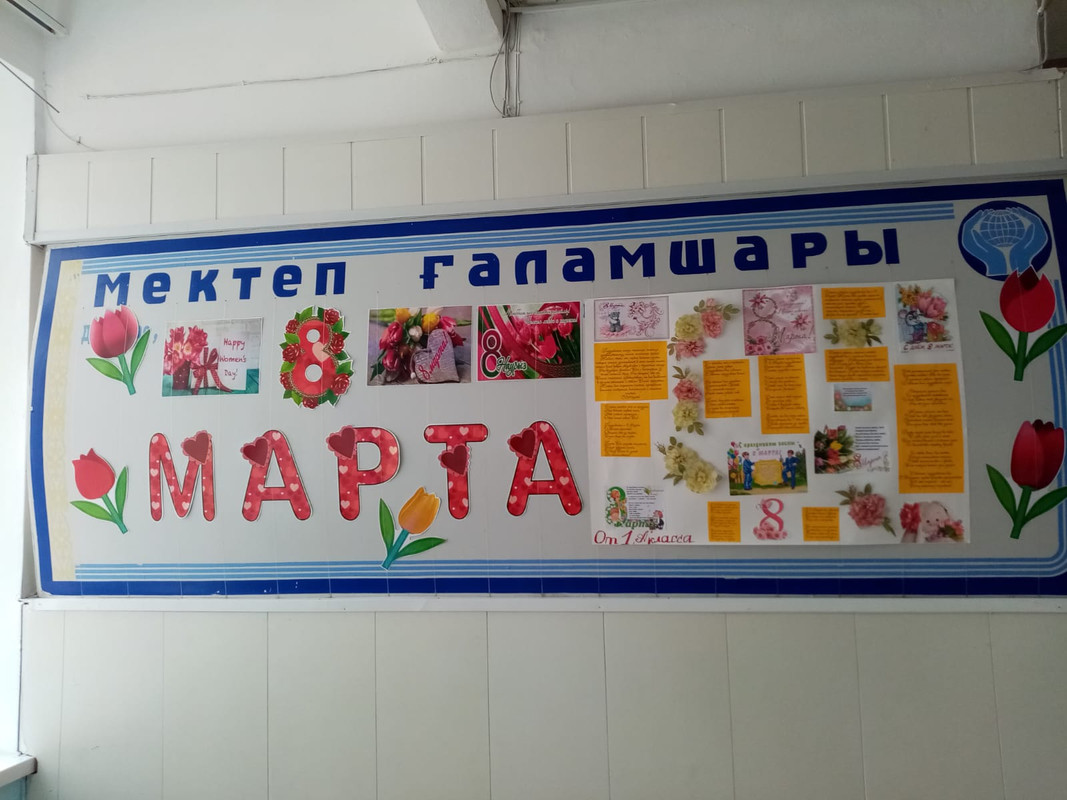 Мектеп ауласында «8 наурыз – Халықаралық әйелдер күні»баннері орналасқан. Осы күні мектепте «Көктемгі көңіл-күй»ақпараттық стенді ресімделді. 6 наурыз-8 наурыз Халықаралық әйелдер күніне арналған сынып сағаттары өткізілді. Ұлдар осы күннің пайда болу тарихын айтып, өлеңдер, байқаулар дайындады. Бастауыш сыныптарда ертеңгіліктер өткізілді, оғаншақырылған аналар мен әжелерқатысты. Осы мереке алдындағы күндері мектеп оқушылары мұғалімдерді - әйелдер, қыздар, мектеп қызметкерлерін мерекемен құттықтады.