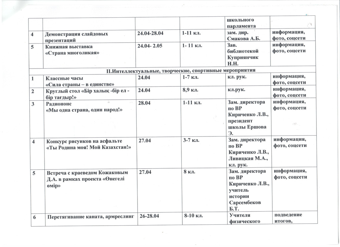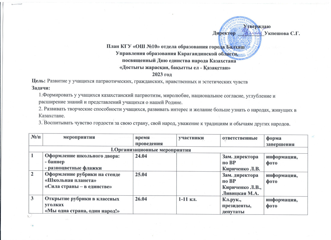 План КГУ «ОШ №10» отдела образования города Балхаш Управления образования Карагандинской области, посвященный Дню единства народа Казахстана «Достығы жарасқан, бақытты ел - Қазақстан» 2023 год