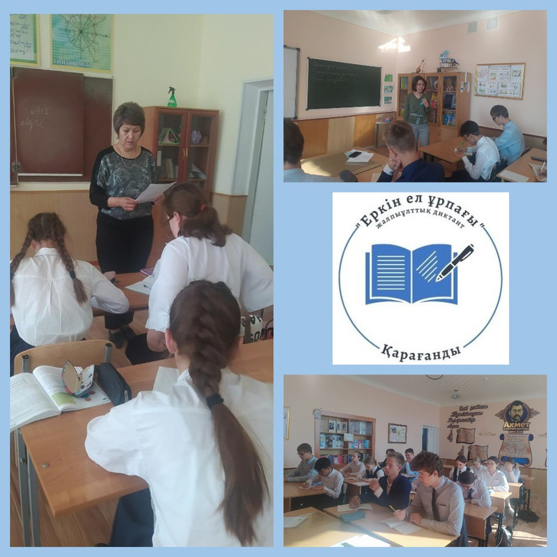 4 апреля в рамках празднования 7 мая,9 мая-Дня Победы учащиеся 5-11 классов,учителя школ провели общенациональный диктант на тему «Еркін ел ұрпағы». Цель диктанта: воспитание любви к Родине, уважения к истории страны, формирование патриотического сознания, обогащение внутреннего мира обучающихся.